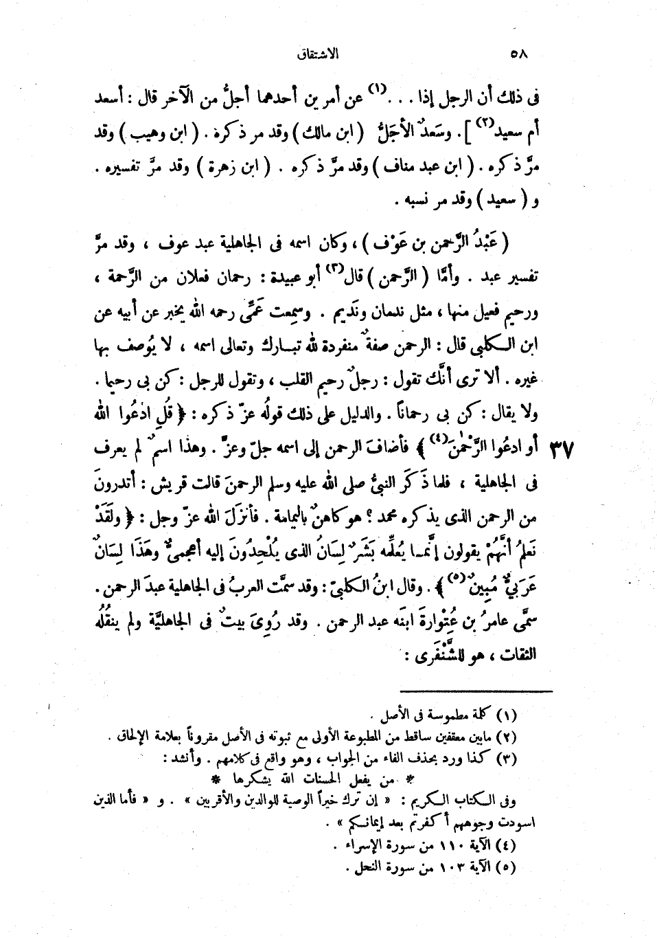 وكان اسمه في الجاهلية عبد عوف، وقد مرَّ تفسير عبد. وأمَّا الرَّحمن قال أبو عبيدة: رحمان فعلان من الرَّحمة، ورحيم فعيل منها، مثل ندمان ونَديم. وسمِعت عمِّي رحمه الله يخبر عن أبيه عن ابن الكلبي قال: الرحمن صفةٌ منفردة لله تبارك وتعالى اسمه، لا يُصف بها غيره. ألا ترى أنَّ: تقول: رجلٌ رحيم القلب، وتقول لرجل: كن بي رحيماً. ولا يقال: كن بي رحماناً. والدليل على ذلك قولُه عزّ ذكره: " قُلِ ادعُوا الله أو ادعُوا الرَّحْمنَ " فأضافَ الرحمن إلى اسمه جلّ وعزَّ. وهذا اسمٌ لم يعرف في الجاهلية، فلما ذَكَر النبيُّ صلى الله عليه وسلم الرحمنَ قالت قريش: أتدرونَ من الرحمن الذي يذكره محمد؟ هو كاهنٌ باليمامة. فأنزَلَ الله عزّ وجل: " ولَقَدْ تَعلمُ أنَّهُمْ يقولون إنَّما يُعلَّمه بَشَرٌ لِسَانُ الذي يُلْحِدُونَ إليه أعجميٌّ وهَذَا لِسَانٌ عَرَبيٌّ مُبِينٌ " وقال ابنُ الكلبيّ: وقد سمَّت العربُ في الجاهلية عبدَ الرحمن. سمَّى عامرُ بن عُتْوارةً ابنَه عبد الرحمن. وقد رُوِيَ بيتٌ في الجاهليَّة ولم ينقُلُه الثقات، هو للشَّنْفَري: