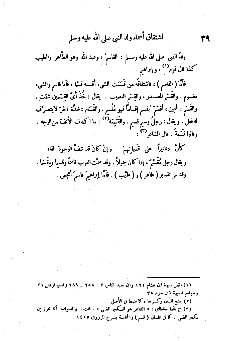ويقال رجل مُقَسَّمٌ، إذا كان جميلاً. وقد سمَّت العرب قاسماً وقسيما ومِقْسَما. وقد مر تفسير طاهر وطيَّب. فأما إبراهيمُ فاسمٌ أعجمي.