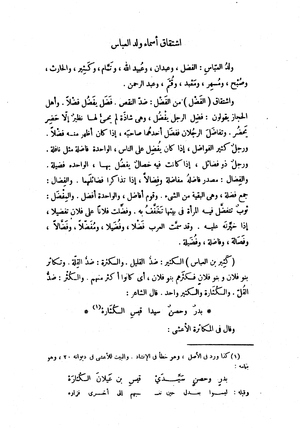 واشتقاق الفَضْل من الفَضْل: ضدّ النقص. فَضَل يفَضُل فضْلاً. وأهل الحجاز يقولون: فضِل الرجل يفْضُل، وهي شاذَة لم يجئ لها نظيرٌ إلا حَضِر يَحضُر. وتفاضَلَ الرجُلان ففضَل أحدهُما صاحبَه، إذا كان أظهر منه فضْلاً. ورجلٌ كثير الفواضل، إذا كان يُفضِل على الناس، والواحدة فاضلة مثل نافلة ورحل ذو فضائل إذا كانت فيه خصال تفضيل بها الواحدة فضيلة. والفِضال: مصدر فاضلهُ مفاضلة وفِضالاً، إذا تذاكرا فضائلَهما. والفِضال: جمع فضلة، وهي البقية من الشيء. وقوم أفاضل، والوحدة فضل، والمِفْضَل: ثوبٌ تتفضَّل فيه المرأة في بيتها تَخَفَّفُ به. وفضَّلت فلاناً على فلان تفضيلاً، إذا خيَّرتَه عليه، وقد سمَّت العرب فَضْلاً، وفُضَيلاً، ومُفَضّلاً، وفَضَّالاً، وفَضَالة، وفاضلة، وفُضَيلة.