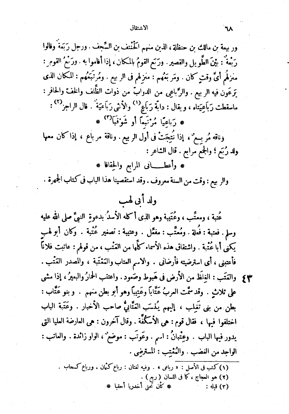 عُتبة، ومعتَّب، وعُتَيبة وهو الذي أكله الأسدُ بدعوةِ النبيِّ صلى الله عليه وسلم. فتعتبة: فُعلة. ومُعتَّب: مفعَّل. وعتيبة: تصغير عُتْبة. وكان أَبو لهبٍ يكنى أَبا عُتْبة. واشتقاق هذه الأسماء كلِّها من المعَتْب، من قولهم: عاتبِت فلاناً فأعتبني، أي استرضيته فأرضاني. والاسم العتاب والمَعْتَبة، والمصدر العَتْب، والعَتَب: الغِلظَ من الأرض في هَبوط وصَعود. واعتنب الحمارُ والبعيرُ، إذا مشى على ثلاثٍ. وقد سمَّت العربُ عتَّاباً وعَتِيباً وهو أَبو بطن منهم. وبنو عَتَّاب: بطن من بني تَغِلب، إليهم يُنسَب العَتَّابيُّ صاحب الأخبار. وعَتَبة الباب اختلفوا فيها، فقال قوم: هي الأسكُفَّة. وقال آخرون: هي العارضة العليا التي يدور فيها الباب. وعِتْبانُ: اسم. وعَوتَب: موضعٌ، الواو زائدة. والعاتب: الواجد من الغضب. والمُعْتِب: المسترضِي.