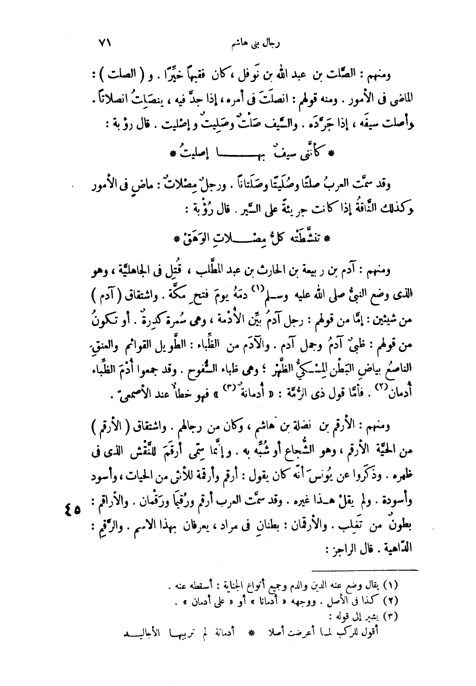 ومنهم: الأَرقم بن نضلة بن هاشم، وكان منم رجالهم. واشتقاق الأرقم من الحيَّة الأَرقم، وهو الشَّجاع أو شُبَّه به. وإنَّما سِمّي أَرقَمَ للنَّقْش الذي في ظهره. وذكَروا عن يُونسَ أنّه كان يقول: أرقم وأَرقمه للأنثى من الحياة، وأسود وأسودة. ولم يقلْ هذا غيره. وقد سمَّت العرب أَرقم ورُقيماً ورَقْمان. والأراقم: بطونٌ من تَغِلب. والأَرقمان: بطنانِ في مراد، يعرفان بهذا الاسم. والرَّمِ: الدّاهية. قال الراجز: