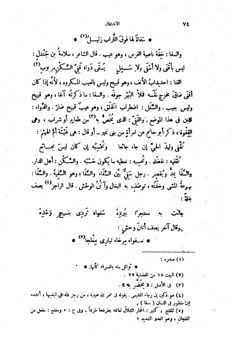 القنا: احديدابُ الأنف، وهو قبيح وليس بالعيب المكروه، لأنَّه إذا كان أقنَى ضاقَ مخرج نفَسَه فملأ البُهْر جوفَه، والسفا: ما ذكرتهُ آنفاً، وهو قبيح وليس بعيب. والسَّغَل: اضطراب الخَلْق، وهو عيبٌ قبيح ضارّ، والدَّواء: اللبن في هذا الموضع. والقَفِيّ: الذي يُخَصُّ به من طعامٍ أو شراب، وهي القِفْوة، ذكر أبو حاتمٍ عن امرأةٍ من بني نمير أو قال: هي غَيثَة أمُّ الهيثم: