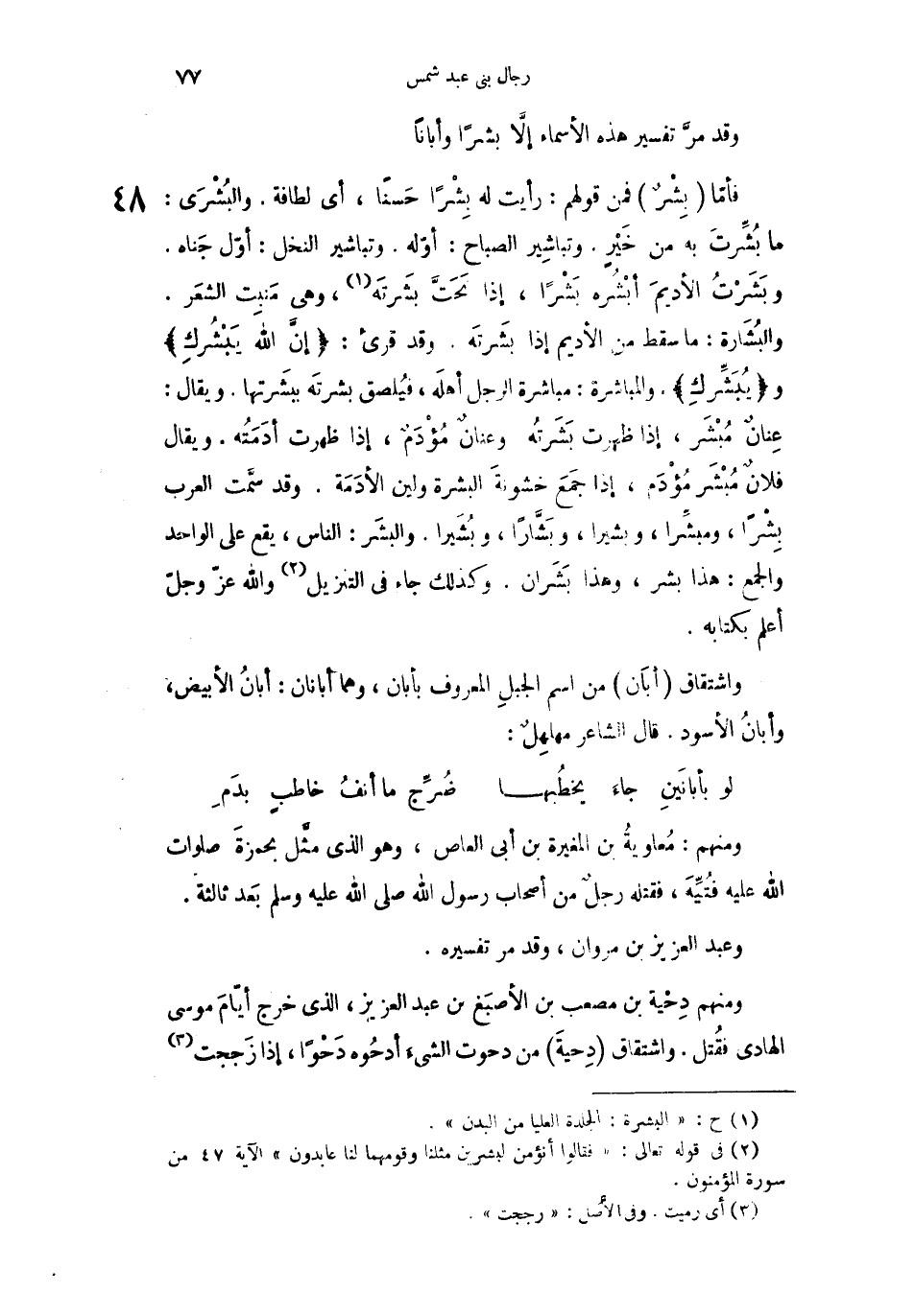 فأما بِشْرٌ فمنم قولهم: رأَيت له بِشْراً حسناً، أي لطَافة. والبُشْرَى: ما بُشِّرتَ به من خَيْرٍ. وتباشِير الصباح: أوَله. وتباشير النخل: أوّل جَناه. وبَشَرْتُ الأديمَ أَبْشُره بَشْراً، إذا تَحَتَّ بشَرتَه، وهي مَنبِت الشعَر. والبُشَارة: ما سقط من الأديم إذا بشَرتَه. وقد قرئ: " إنَّ الله يَبْشُركِ " و " يُبَشِّركِ " والمباشرة: مباشرة الرجل أهلَه، فيُلصق بشرتَه ببشَرتها. ويقال: عِنانٌ مُبْشَر، إذا ظهرت بَشَرتُه. وعنانٌ مُؤْدَمٌ، إذا ظهرت أدَمَتُه. ويقال فلانٌ مُبْشَر مُؤْدَم، إذا جَمعَ خشونةَ البشرة ولين الأَدَمَة. وقد سمَّت العرب بِشْراً، ومبشِّراً، وبشيراً، وبَشَّاراً، وبُشَيراً. والبشَر: الناس، يقع على الواجد والجمع: هذا بشر، وهذا بَشَران. وكذلك جاء في التنزيل والله عزّ وجلّ أعلم بكتابه.