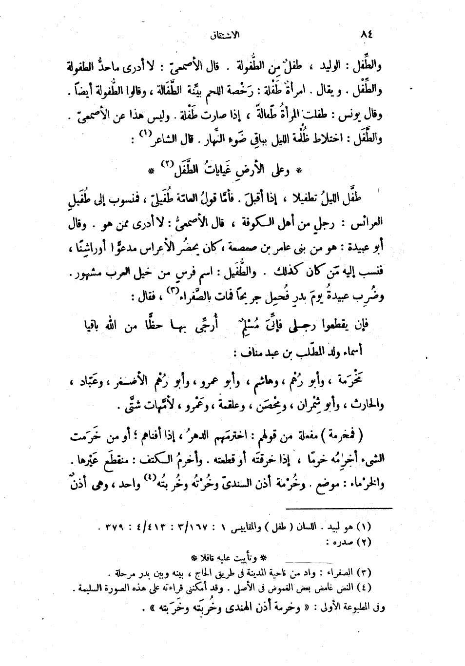 طفَّل الليلُ تطفيلاً، إذا أقبلَ. فأمَّا قولُ العامَة طُفَيليّ، فمنسوب إلى طُفَيلِ العرائس: رجلٍ من أهل الكوفة، قال الأصمعيُّ: لا أدري ممن هو. وقال أبو عبيدة: هو من بني عامر بن صعصعة، كان يحضُر الأعراس مدعوَّاً أرراشِناً، فنسب إليه مَن كان كذلك. والطُّفَيل: اسم فرسٍ من خيل العرب مشهور. وضُرِب عبيدةُ يومَ بدرٍ فُحمِل جريحاً فمت بالصَّفراء، فقال: