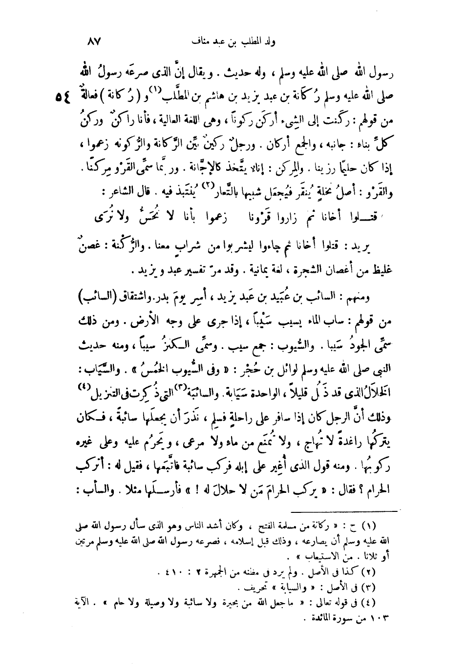 ومنهم: السائب بن عُبَيد بن عَبد يزيد، أسِير يومَ بدر. واشتقاق السائب من قولهم: ساب الماء يسيب سَيْباً، إذا جرى على وجه الأرض. ومن ذلك سمِّي الجودُ سَيباً. والسُّيوب: جمع سيب. وسمِّي الكنزُ سيباً، ومنه حديث النبي صلى الله عليه وسلم لوائل بن حُجْر: " وفي السُّيوب الخمُسُ ". والسَّيَاب: الخَلاَلُ الذي قد ذَيُل قليلاً، والواحدة سَيَابة. والسائبة التي ذُكِرت في التنزيل وذلك نَّ الرجل كان إذا سافر على راحلةٍ فسلم، نَذرَ أن يجعلَها سائبةً، فكان يتركُها راغدةً لا تُهاج، ولا تُمنَع من ماءٍ ولا مرعى، ويَحرُم عليه وعلى غيره ركوبُها. ومنه قول الذي أُغِير على إبله فركب سائبة فاتَّبَعها، فقيل له: أتركب الحرام؟ فقال: " يركب الحرامَ مَن لا حلالَ له! " فأرسلَها مثلاً. والسأب: