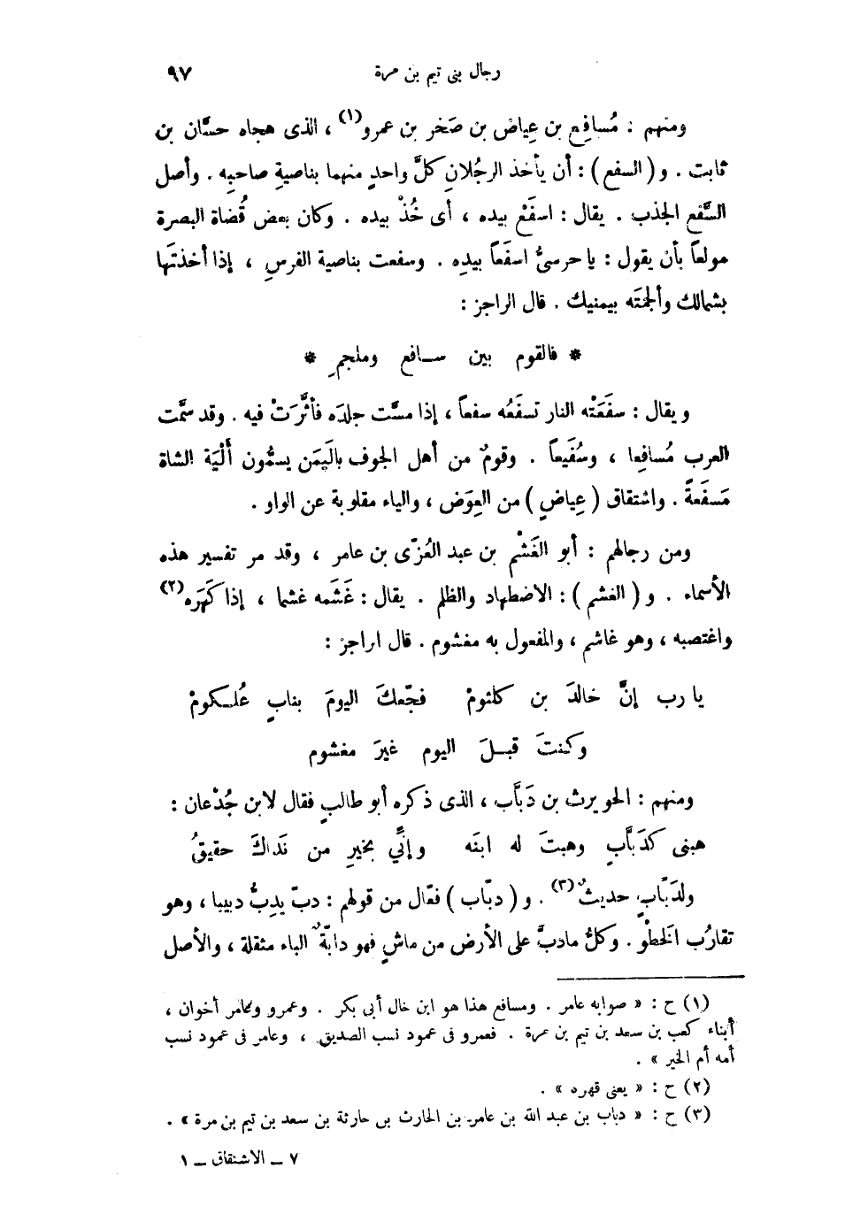 ومنهم: مُسافِع بن عِياض بن صَخر بن عمرو، الذي هجاه حسَّان بن ثابت. والسفع: أن يأخذ الرجُلانِ كلَّ واحدٍ منهما بناصيةِ صاحبِه. وأصل السَّفع الجذب. يقال: اسفَعْ بيده، أي خُذْ بيده. وكان بعضُ قُضاة البصرة مولعاً بأن يقول: يا حرسي! ُ اسفَعا بيدِه. وسفعت بناصية الفرسِ، إذا أخذتَها بشمالك وألجمتَه بيمينك. قال الراجز: