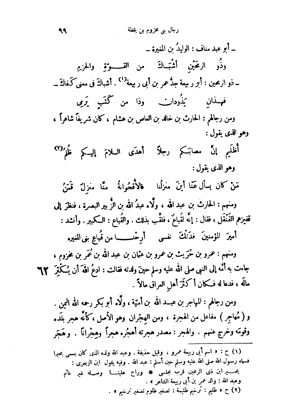 ومن رجالهم: المهاجر بن عبد الله بن أميّة، ولاَّه أبو بكر رحمه الله اليمن. ومُهاجِر مفاعل من الهجرة، ومن الهِجْران وهو الأصل، كأنَّه هجر بلَده وقومَه وخرج عنهم، والهجر: مصدر هجرته أهجُره هجراً وهِجْراناً. وهَجر