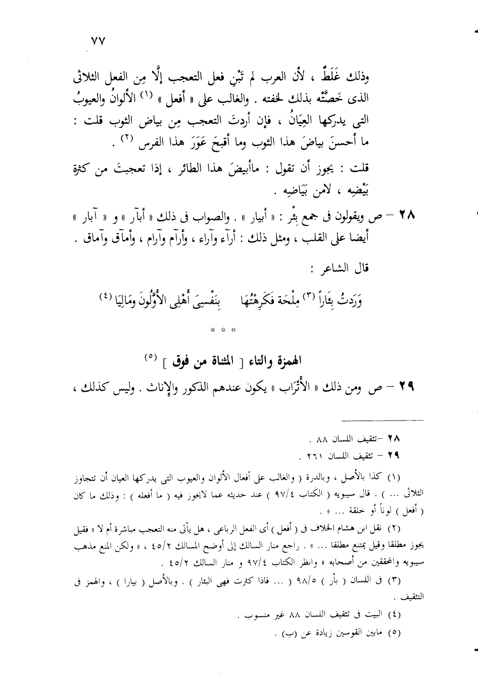 (ز) ويقولون لجماعة الفَرْو: أفْريَة، وذلك خطأ، لأنّ أفْعِلَة ل ايأتي جمعاً لفَعْل ولا لأمثاله من الثلاثي. والصواب: أفْرٍ وفِراء، مثل دَلْوٍ وأدْلٍ ودِلاء، وجَدْيٍ وأجْدٍ وجِداء.