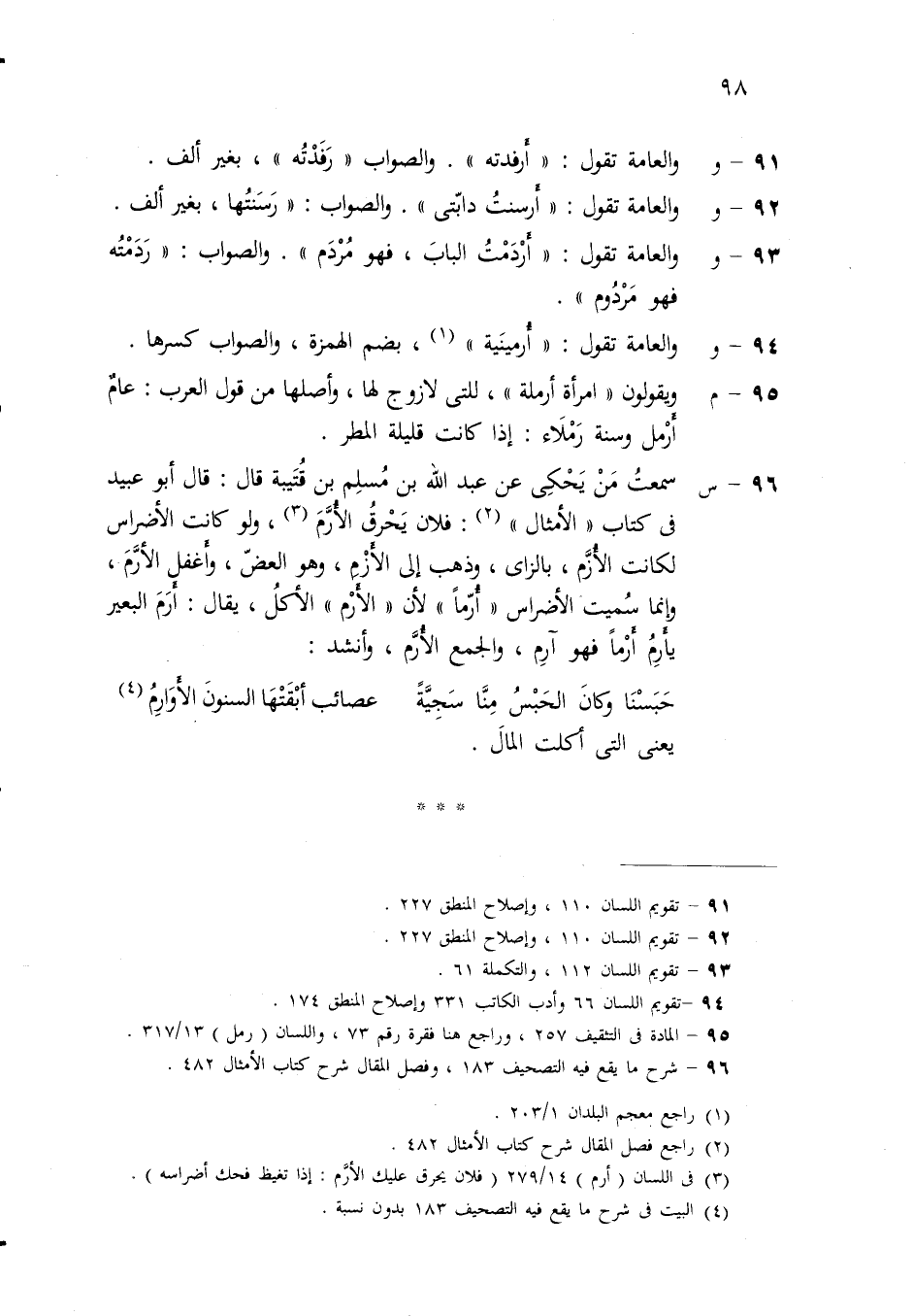 (ح) يقولون: في جمع أوقيّة: أواقٌ، على وزن أفعال، فيغلطون فيه؛ لأن ذلك جمع أوْقٍ وهو الثِّقَل. فأما أوقيّة فتجمع على أواقيّ بتشديد الياء، كما تجمع أمنيّة على أمانيّ، وقد خفَّف بعضهم فقال: أواقٍ كما قال في صحاري: صحارٍ.