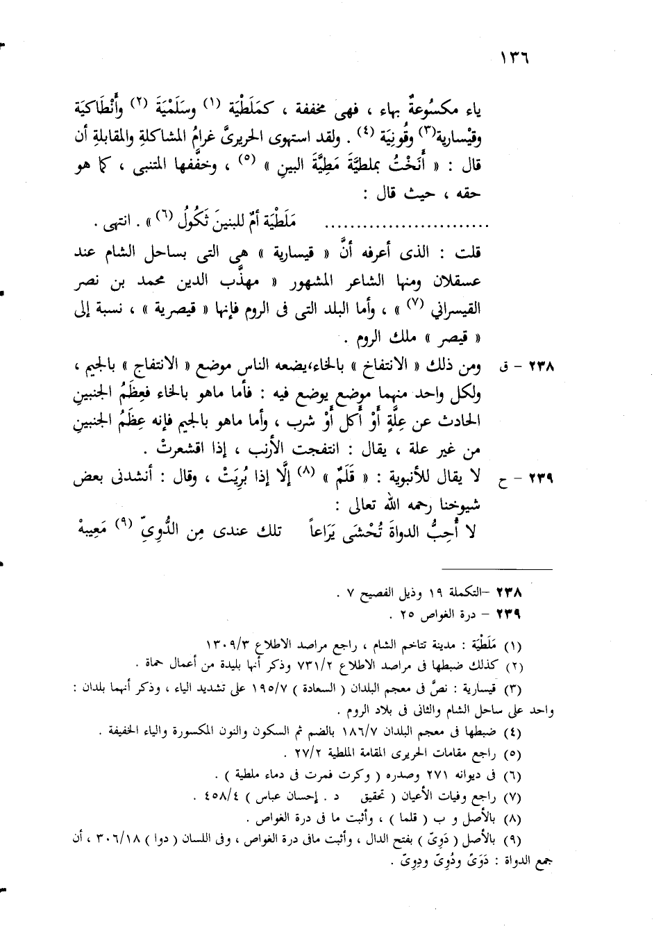 (ح) ويقولون في جمع بيضاء وصفراء وسوداء: بيضاوات وصفراوات وسوداوات. وهو لحن فاحش، لأن العرب لم تجمع فَعْلاء التي هي مؤنثة أفْعَل بالألف والتاء، بل جمعته على فُعْل، نحو: بيض وصُفْر وسُود، كما جاء في القرآن: (ومِنَ الجِبالِ جُدَدٌ بيضٌ وحُمْرٌ مُخْتَلِفٌ ألوانُها وغَرابيبُ سودٌ) .