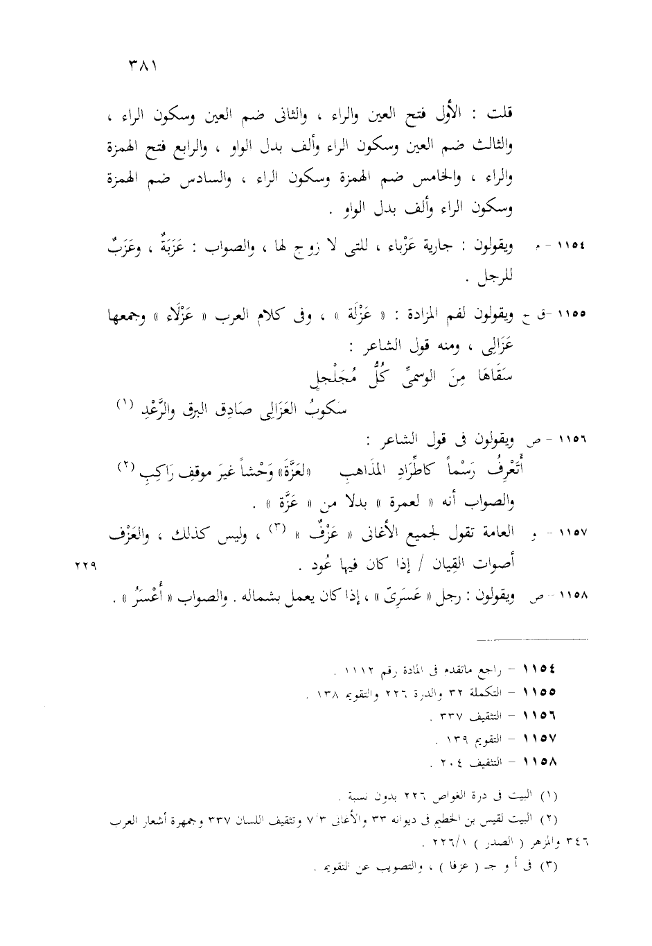(ص) وكذلك قولهم لساكن القيروان: قَرَويّ. وليس كذلك، بل كل مَنْ سكن القرية يقال له: قارٍ وقَرَويّ، وكل من سكن البادية يقال له: بادٍ وبَدَويّ، فليس القيروان أحقَّ بهذا النسب من غيرها.