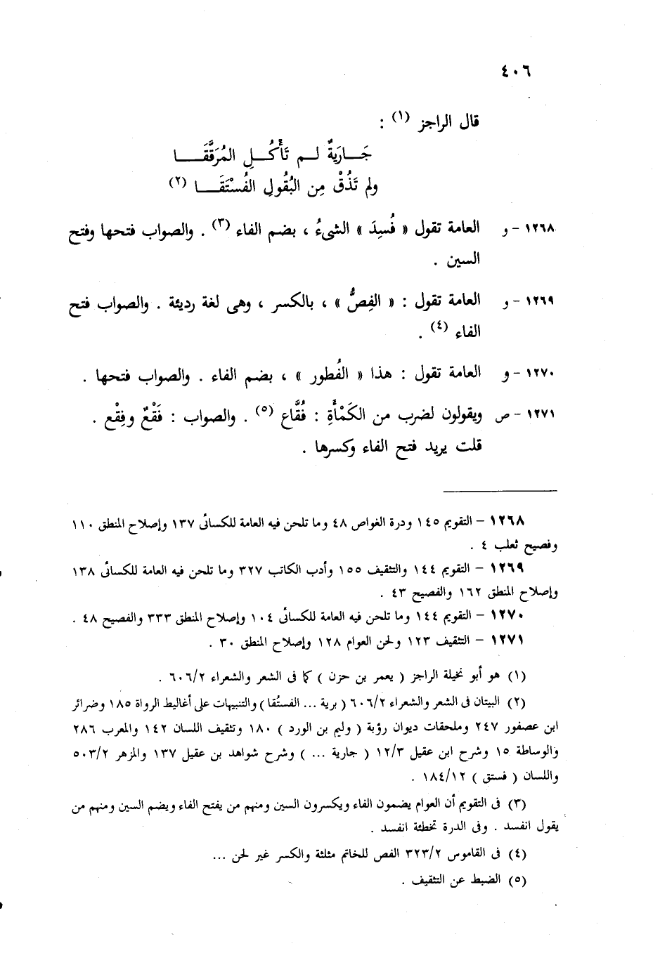 (ز) ويقولون للوعاء الذي يجعل الرجلُ فيه متاعه عند السفر من سكين وغيره: كيْف. والصواب كِنْف، بالنون، لأنه يكتنف ما فيه، ومنه قول عمر رضي الله عنه في ابن مسعود: كُنَيْفٌ حُشِيَ عِلْماً.