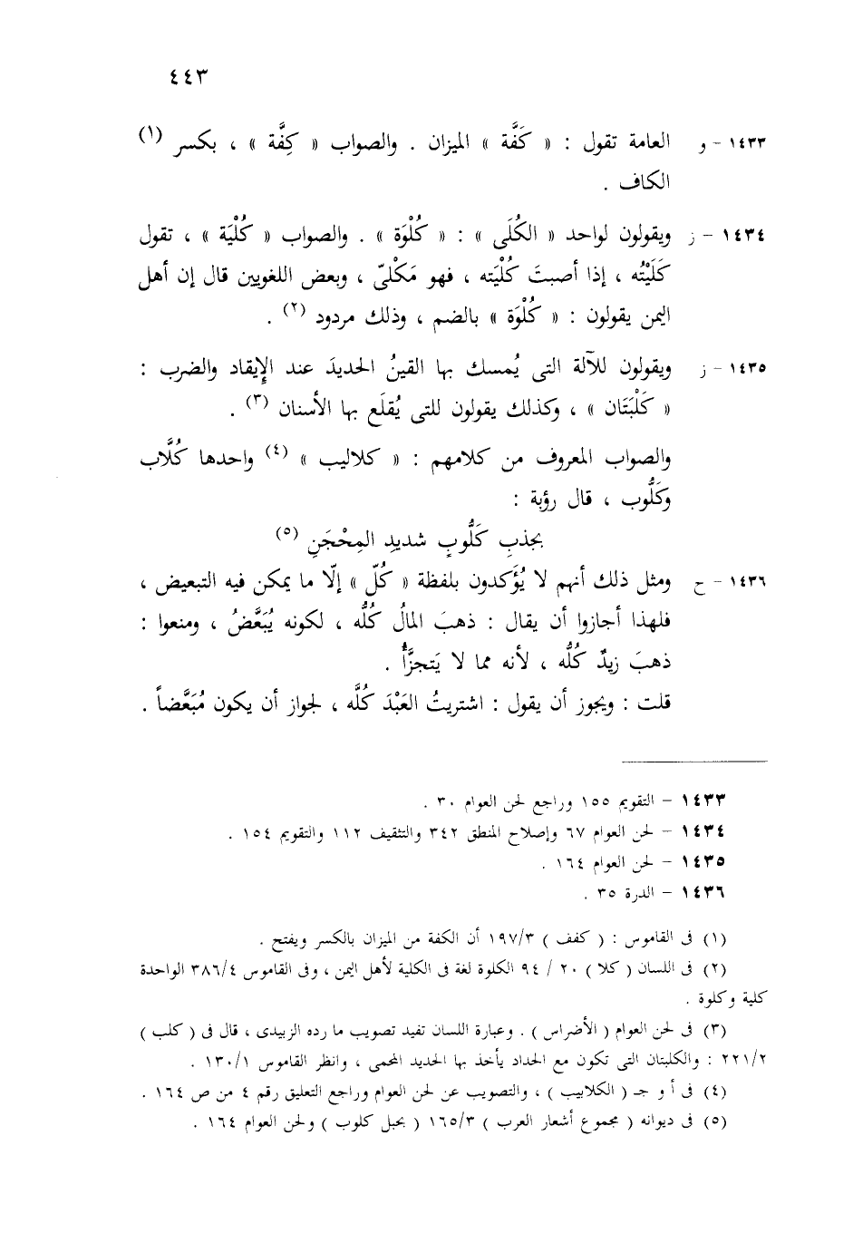 (ز) ويقولون: لزِم الناسُ مَصافَهم، فيخففون. والصواب لزِموا مَصَفَّهم ومَصافَّهم، بالتشديد.