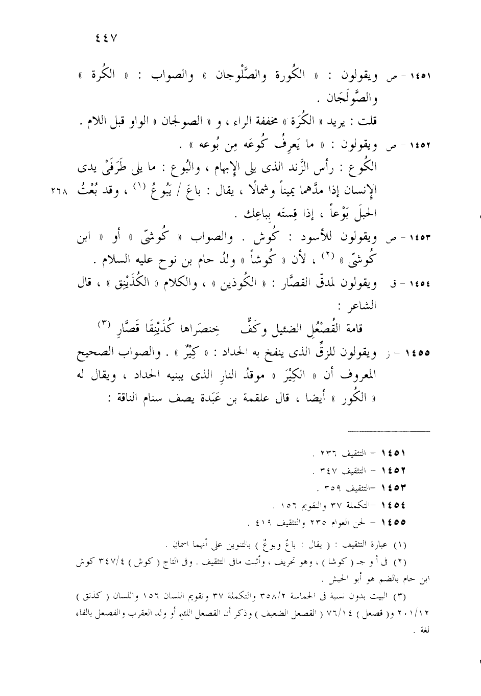 (ز) يقولون: رجل مُعَرْبِض. واصوابه مُعَرْبِد، بالدال غير المعجمة، قال ابن قتيبة: اشتقاقه من العِرْبَدّ، وهي حية تنفخ ولا تؤذي.