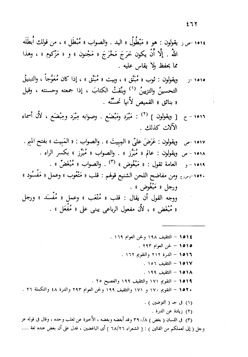 (ز) ويقولون: رجل موْسوع عليه. والصواب مُوَسَّع عليه، وقد أوسَع الرجلُ إيساعاً، إذا استغنى.
