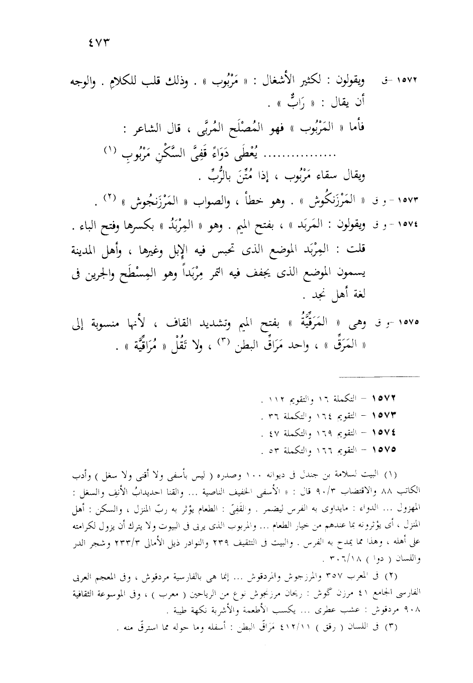(ح) ومما لا يستعمل إلا في الشّرِّ قولهم: ندّد به وسمّع به، وقولهم قيّض له كذا، ومثله (وباءُوا بغَضَبٍ ... ) ، وذكر أهل التفسير أنه لم يأت لفظ الأمطار ولا لفظ الريح إلا في الشّرِّ.