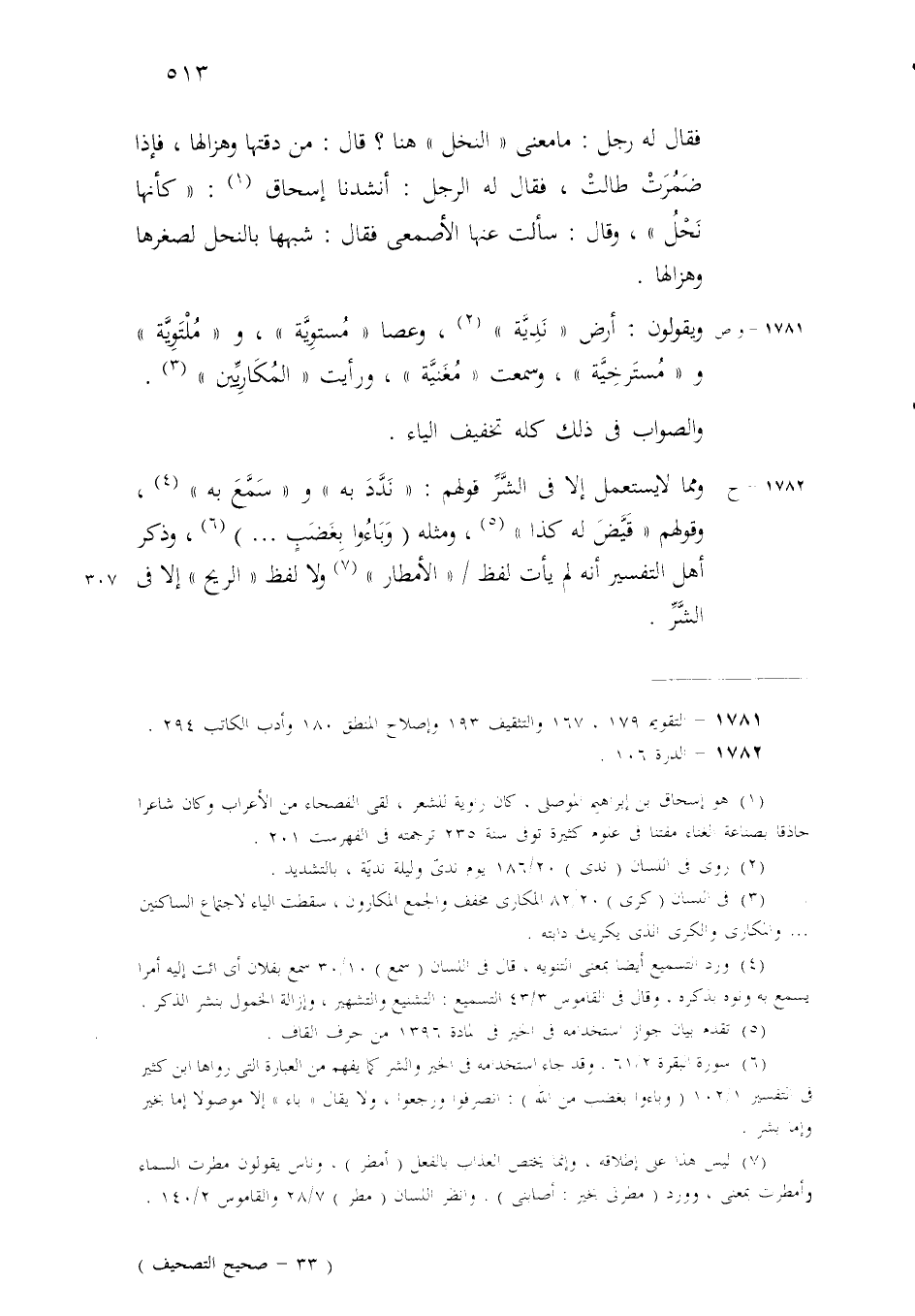 لَتجتمع عليه الذنوبُ فيحارفُ عند الموت، فقرأه الرجل بالجيم والزاي، فانتبه فقال: أتصحِّفون وتروونه عني هكذا؟ فإذا قيل: عمّن رويتم؟ قلتم حدثنا به الرياشي! أفترون الرياشيَّ يُخطِئُ ويُصحِّف؟! إنما هو يُحارف، أي يُقايسُ، ثم أنشد: