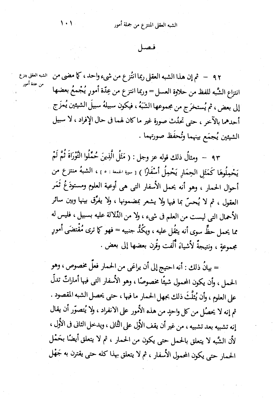 ثم إن هذا الشبه العقلي ربما انتُزع من شيء واحد، كما مضى انتزاع الشَّبه للفظ من حلاوة العسل وربما انتزع من عِدَّة أمورِ يُجْمَع بعضها إلى بعض، ثم يُستخرَج من مجموعها الشَبَهُ، فيكون سبيلهُ سبيلَ الشيئين يُمزَج أحدهما بالآخر، حتى تحدُث صورة غير ما كان لهما في حال الإفراد، لا سبيل الشيئين يَجمَع بينهما وتُحفَظ صورتهما، ومثالُ ذلك قوله عزّ وجلّ: " مَثَلُ الَّذِينَ حُمِّلُواْ التَّوْرَاةَ ثُمَّ لَمْ يَحْمِلُوهَا كَمَثَلِ الحِمَار يَحْمِلُ أسْفَارَاً " " الجمعة: 5 "، الشبهُ منتزع من أحوال الحمار، وهو أنه يحمل الأسفار التي هي أوعية العلوم ومستودَعُ ثَمَر العقول، ثم لا يُحسّ بما فيها ولا يشعر بمضمونها، ولا يفرِّق بينها وبين سائر الأحمال التي ليست من العلم في شيء، ولا من الدَّلالة عليه بسبيل، فليس له مما يحمل حظٌّ سوى أنه يثقُلُ عليه، ويكُدُّ جنبيه فهو كما ترَى مُقْتضَى أمورٍ مجموعةٍ، ونتيجةٌ لأشياءَ أُلّفت وقُرن بعضها إلى بعض، بيانُ ذلك: أنه احتيج إلى أن يراعَى من الحمار فعلٌ مخصوص، وهو الحمل، وأن يكون المحمول شيئاً مخصوصاً، وهو الأسفار التي فيها أماراتٌ تدلّ على العلوم، وأن يُثلَّثَ ذلك بجهل الحمار ما فيها، حتى يحصل الشبه المقصود، ثم إنه لا يحصلُ من كل واحدٍ من هذه الأمور على الانفراد، ولا يُتصوّر أن يقال إنه تشبيه بعد تشبيه، من غير أن يقف الأول على الثّاني، ويدخل الثاني في الأول، لأن الشَّبه لا يتعلق بالحمل حتى يكون من الحمار، ثم لا يتعلق أيضاً بحَمْلِ الحمار حتى يكون المحمول الأسفار، ثم لا يتعلق بهذا كله حتى يقترن به جَهْل