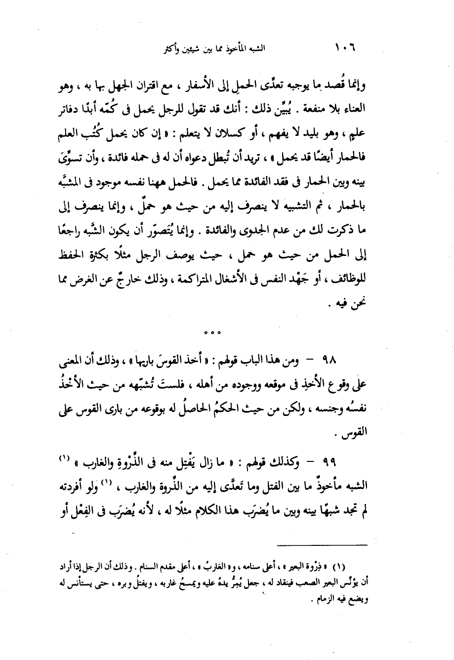 وإنما قُصد ما يوجبه تعدِّي الحملِ إلى الأسفار، مع اقتران الجهل بها به، وهو العناء بلا منفعة، يُبيِّن ذلك: أنك قد تقول للرجل يحمل في كُمّه أبداً دفاتر علمٍ، وهو بليد لا يفهم، أو كسلان لا يتعلم: إن كان يحمل كُتُب العلم فالحمار أيضاً قد يحمل، تريد أن تُبطل دعواه أن له في حمله فائدة، وأن تسوَّيَ بينه وبين الحمار في فقد الفائدة مما يحمل، فالحمل ها هنا نفسه موجود في المشبَّه بالحمار، ثم التشبيه لا ينصرف إليه من حيث هو حملٌ، وإنما ينصرف إلى ما ذكرت لك من عدم الجدوى والفائدة، وإنما يُتَصوّر أن يكون الشَّبه راجعاً إلى الحمل من حيث هو حمل، حيث يوصف الرجل مثلاً بكثرة الحفظ للوظائف، أو جَهْد النفس في الأشغال المتراكمة، وذلك خارجٌ عن الغرض مما نحن فيه، ومن هذا الباب قولهم: أخذ القوسَ باريها، وذلك أن المعنى على وقوع الأخذِ في موقعه ووجودهِ من أهله، فلستَ تُشبّهه من حيث الأخْذُ نفسُه وجنسه، ولكن من حيث الحكمُ الحاصلُ له بوقوعه من باري القوس على القوس، وكذلك قولهم: ما زال يَفْتِل منه في الذِّرْوةِ والغارب الشبه مأخوذٌ ما بين الفتل وما تَعدَّى إليه من الذِّروة والغارب، ولو أفردته لم تجد شبهاً بينه وبين ما يُضرَب هذا الكلام مثلاً له، لأنه يُضرَب في الفِعْل أو