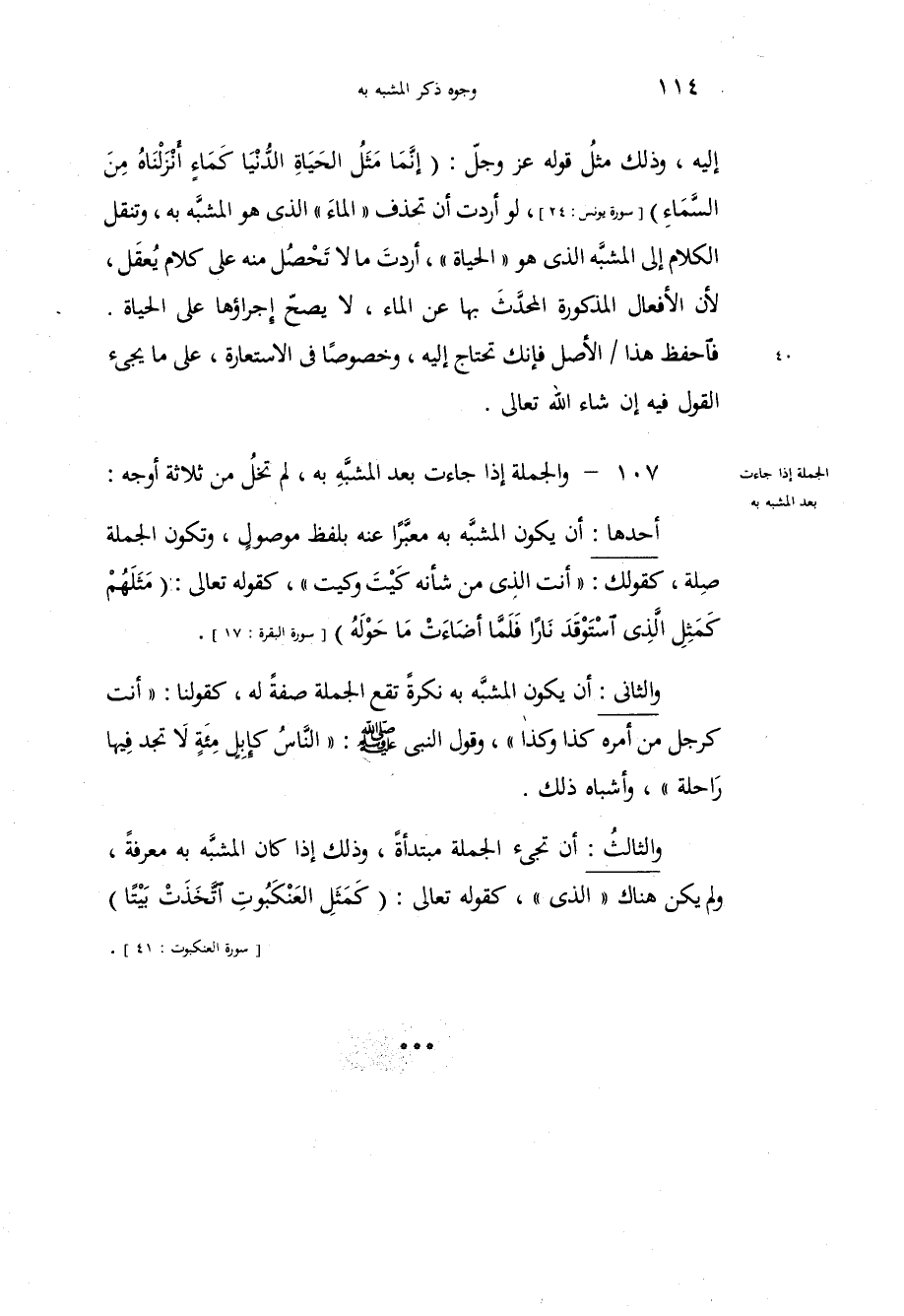 إليه، وذلك مثلُ قوله عزّ وجلّ: " إنَّمَا مَثَلُ الحَيَاةِ الدُّنْيَا كََمَاءٍ أنْزَلْنَاهُ مِنَ السَّمَاءِ " " يونس: 42 "، لو أردت أن تحذف الماء الذي هو المشبَّه به، وتنقل الكلام إلى المشبَّه الذي هو الحياة، أردتَ ما لا تحْصُل منه على كلام يُعقَل، لأن الأفعال المذكورة المحدَّثَ بها عن الماء، لا يصحّ إجراؤها على الحياة فاحفظ هذا الأصل فإنك تحتاج إليه، وخصوصاً في الاستعارة، على ما يجيء القول فيه إن شاء الله تعالى، والجملة إذا جاءت بعد المشبَّهِ به، لم تخلُ من ثلاثة أوجه أحدها أن يكون المشبَّه به معبَّراً عنه بلفظ موصولٍ، وتكون الجملة صِلة، كقولك أنت الذي من شأنه كَيْتَ وكيت، كقوله تعالى: " مَثَلَهُمْ كَمَثَلِ الَّذِي اسْتَوْقَدَ نَاراً فَلَّمَا أَضَاءَتْ مَا حَوْلَهُ " " البقرة: 71 "، والثاني أن يكون المشبَّه به نكرةً تقع الجملة صفةً له، كقولنا أنت كرجل من أمره كذا وكذا، وقول النبي صلى الله عليه وسلم: " النَّاسُ كإبِلٍ مِئةٍ لا تجد فيها رَاحلة "، وأشباه ذلك، والثالثُ أن تجيء مبتدأةً، وذلك إذا كان المشبَّه به معرفةً، ولم يكن هناك الذي، كقوله تعالى: " كَمَثَلِ العَنْكَبُوتِ اتَّخَذَتْ بَيْتَاً " " العنكبوت: 14 ".