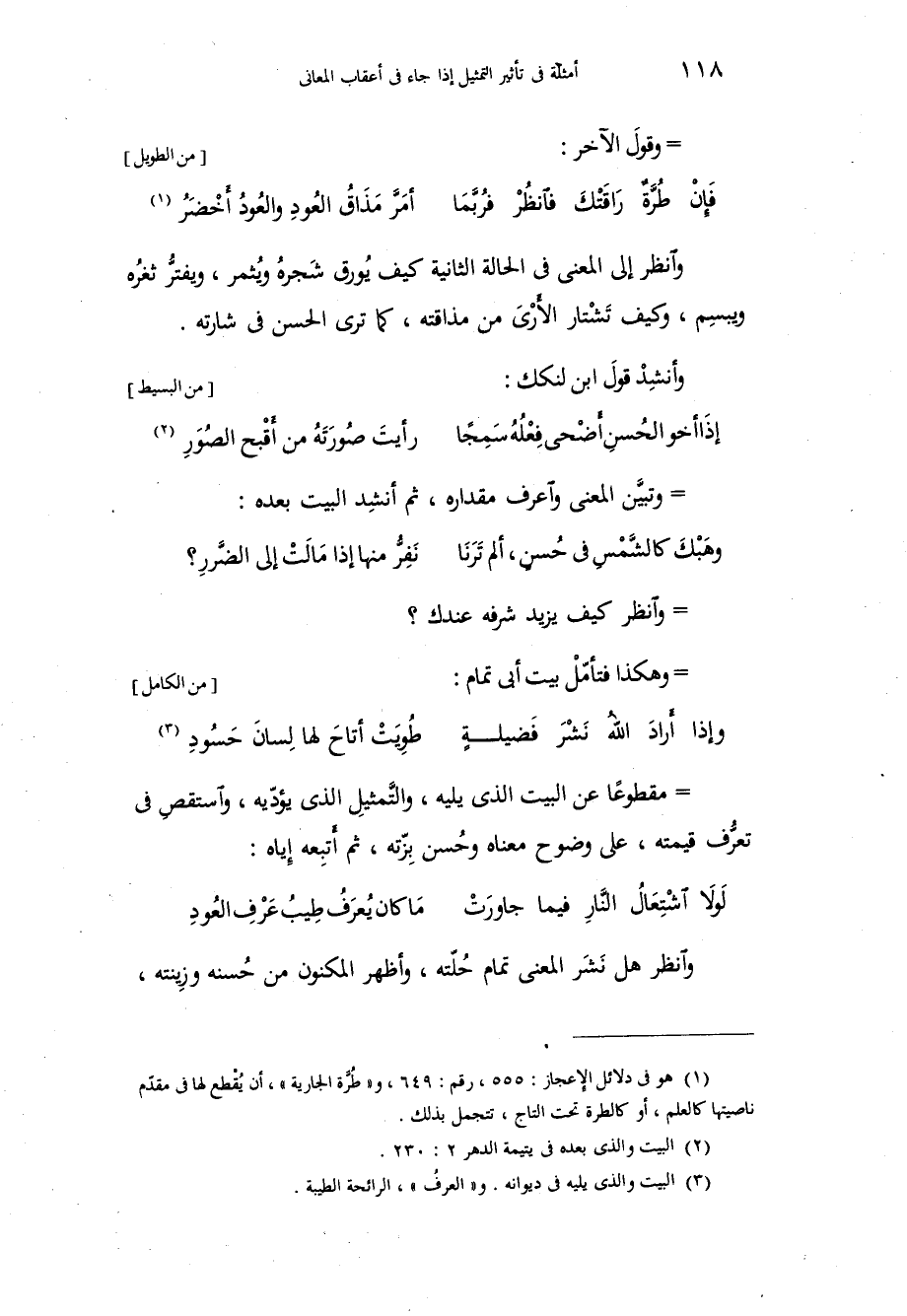 لو كان سلك بالمعنى الظاهر من العبارة كقولك: إن الجاهل الفاسد الطبع يتصوّر المعنى بغير صورته، ويُخيَّل إليه في الصواب أنه خطأ، هل كنت تجد هذه الرَوعة، وهل كان يبلغ من وَقْم الجاهل ووَقْذه، وقمعه ورَدْعه والتهجين له والكشف عن نَقْصه، ما بَلغ التمثيلُ في البيت، وينتهي إلى حيث انتهى، وإن أردت اعتبارَ ذلك في الفنّ الذي هو أكرم وأشرف، فقابلْ بين أن تقول: إن الذي يعظ ولا يَتَّعظ يُضِرُّ بنفسه من حيث ينفع غيره، وتقتصرَ عليه وبَين أن تذكر المَثَل فيه على ما جاء في الخبر من أن النبي صلى الله عليه وسلم قال: " مَثَلُ الّذي يعلِّم الخيرَ ولا يَعْمَلُ به، مثلُ السِّراج الذي يضيء للناس ويُحرق نفسه "، ويروي: مَثَلُ الفتيلة تُضيء للناس وتُحرق