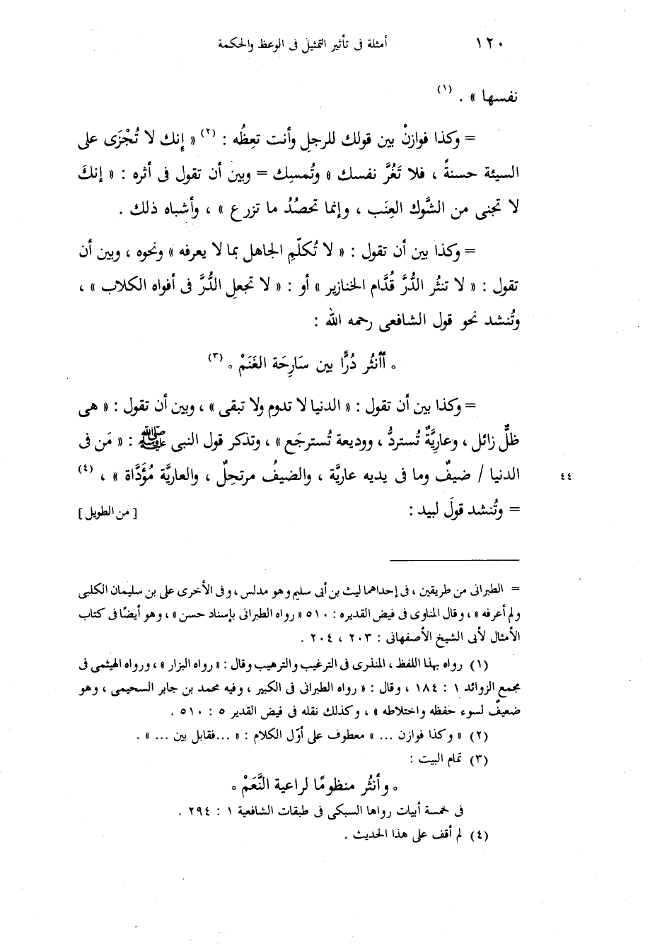 " أأنثُر دُرّاً بين سَارِحَة الغَنَمْ " وكذا بين أن تقول: الدنيا لا تدوم ولا تبقى، وبين أن تقول: هي ظلٌّ زائل، وعارِيَّةٌ تُستردُّ، ووديعة تُسترجَع، وتذكر قول النبي صلى الله عليه وسلم: " مَنَْ في الدنيا ضيفٌ وما في يديه عاريَّة، والضيفُ مرتحِلٌ، والعاريَّة مُؤَدّاة "، وتُنشد قولَ لبيد: