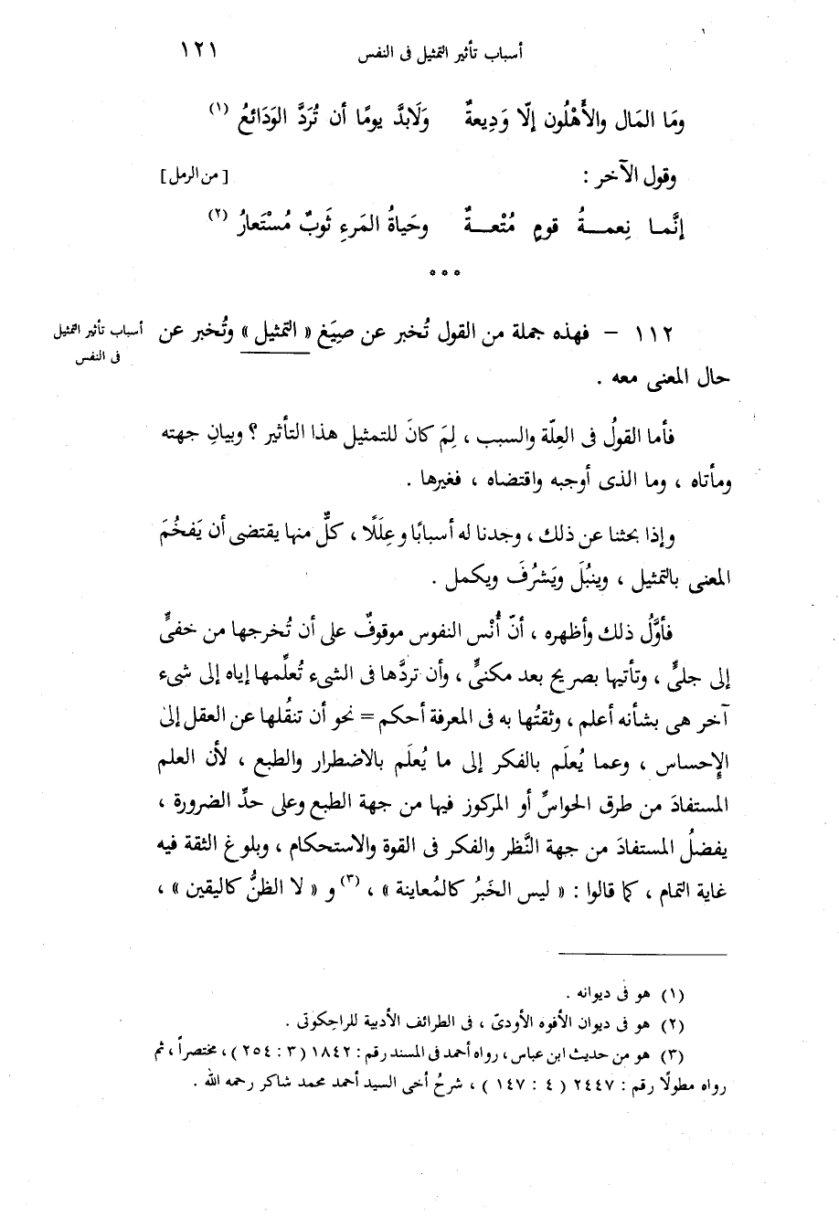 فهذه جملة من القول تُخبر عن صِيَغ التمثيل وتُخبر عن حال المعنى معه، فأما القولُ في العِلّة والسبب، لِمَ كان للتمثيل هذا التأثير؛ وبيانِ جهته ومأتاه، وما الذي أوجبه واقتضاه، فغيرها، وإذا بحثنا عن ذلك، وجدنا له أسباباً وعِلَلاً، كلٌّ منها يقتضي أن يَفخُمَ المعنى بالتمثيل، وينبُلَ ويَشرُفَ ويكمل، فأَوَّلُ ذلك وأظهره، أنّ أُنْس النفوس موقوفٌ على أن تُخرجها من خفيٍّ إلى جليٍّ، وتأتيها بصريح بعد مكنىٍّ، وأن تردَّها في الشيء تُعلِّمها إياه إلى شيء آخر هي بشأنه أعلم، وثقتُها به في المعرفة أحكم نحو أن تنقُلها عن العقل إلى الإحساس وعما يُعلَم بالفكر إلى ما يُعلم بالاضطرار والطبع، لأن العلم المستفادَ من طرق الحواسِّ أو المركوز فيها من جهة الطبع وعلى حدِّ الضرورة، يفضلُ المستفاد من جهة النَّظر والفكر في القوة والاستحكام، وبلوغ الثقة فيه غاية التمام، كما قالوا: ليس الخَبرُ كالمُعاينة، ولا الظنُّ كاليقين،