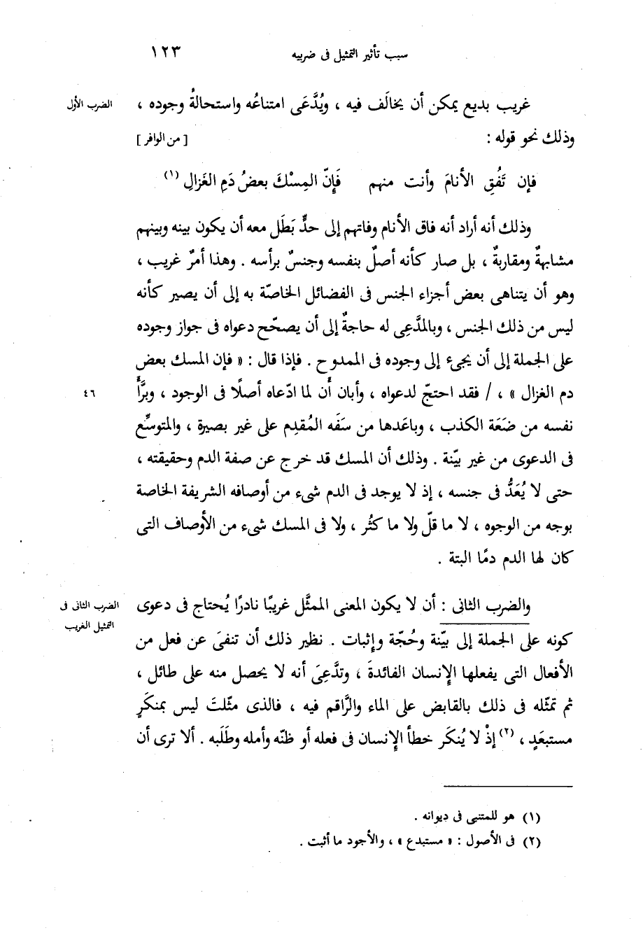 وذلك أنه أراد أنه فاق الأنام وفاتهم إلى حدٍّ بَطَل معه أن يكون بينه وبينهم مشابهةٌ ومقاربةٌ، بل صار كأنه أصلٌ بنفسه وجنسٌ برأسه، وهذا أمرٌ غريب، وهو أن يتناهى بعض أجزاء الجنس في الفضائل الخاصّة به إلى أن يصير كأنه ليس من ذلك الجنس، وبالمدَّعِي له حاجة إلى أن يصحّح دعواه في جواز وجوده على الجملة إلى أن يجيء إلى وجوده في الممدوح، فإذا قال: فإن المسك بعض دم الغزال، فقد احتجّ لدعواه، وأبان أن لما ادّعاه أصلاً في الوجود، وبرّأ نفسه من ضَعَة الكذب، وباعَدها من سَفَه المُقدِم على غير بصيرة، والمتوسِّع في الدعوى من غير بيّنة، وذلك أن المسك قد خرج عن صفة الدم وحقيقته، حتى لايُعَدُّ في جنسه، إذ لا يوجد في الدم شيء من أوصافه الشريفة الخاصة بوجه من الوجوه، لا ما قلّ ولا ما كثُر، ولا في المسك شيء من الأوصاف التي كان لها الدم دماً البتة. والضرب الثاني أن لا يكون المعنى الممثَّل غريباً نادراً يُحتاج في دعوى كونه على الجملة إلى بيّنة وحُجّة وإثبات، نظير ذلك أن تنفيَ عن فعل من الأفعال التي يفعلها الإنسان الفائدة، وتدَّعِيَ أنه لا يحصل منه على طائل، ثم تمثّله في ذلك بالقابض على الماء والرَّاقم فيه، فالذي مثّلتَ ليس بمنكرٍ مستبعَدٍ، إذ لا يُنكَر خطأ الإنسان في فعله أو ظنّه وأمله وطَلَبه، ألا ترى أن