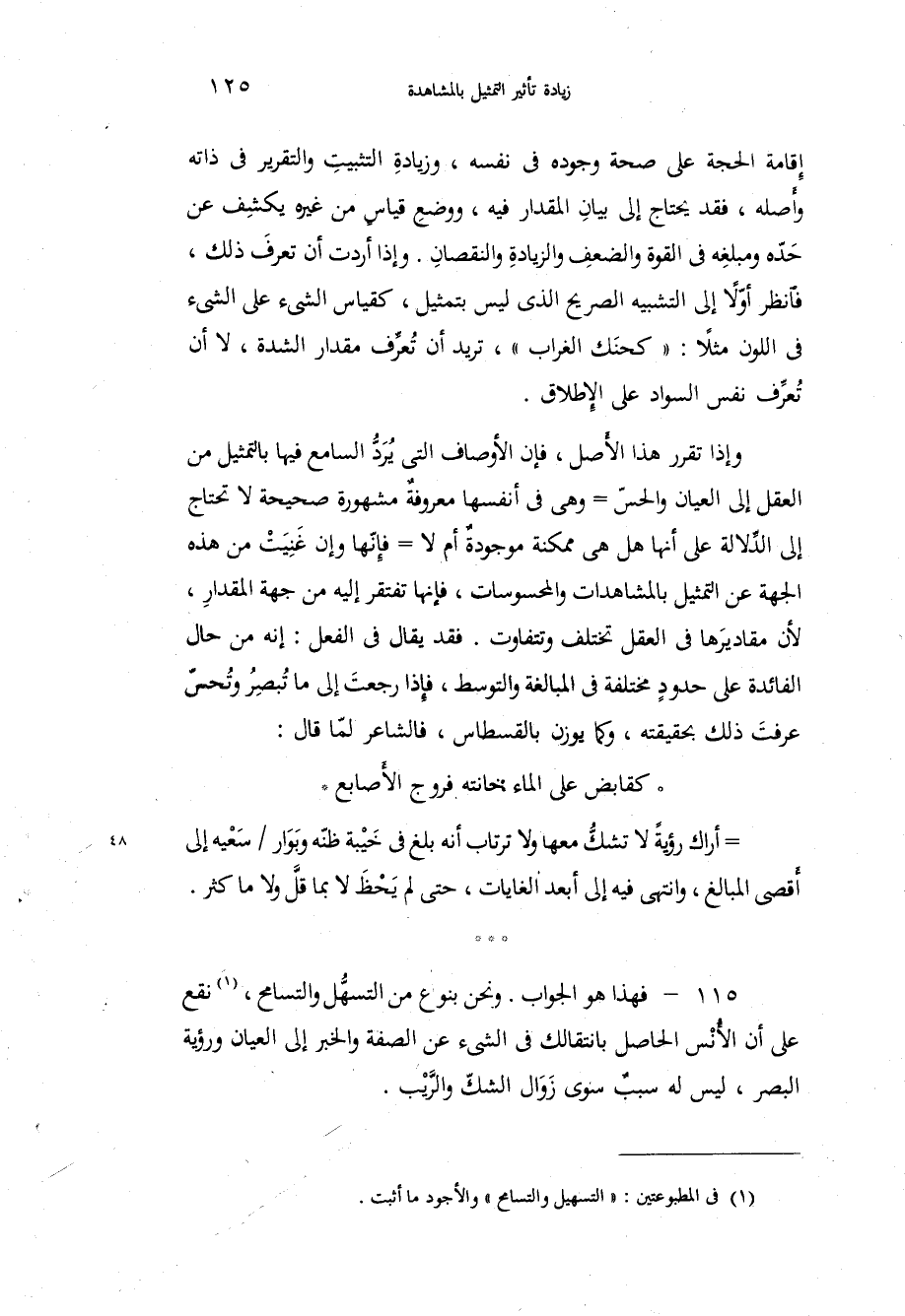 إقامة الحجة على صحة وجوده في نفسه، وزيادةِ التثبيتِ والتقرير في ذاته وأصله، فقد يحتاج إلى بيانِ المقدار فيه، ووضعِ قياس من غيره يكشِف عن حَدّه ومبلغِه في القوة والضعفِ والزيادةِ والنقصانِ، وإذا أردت أن تعرفَ ذلك، فانظر أوّلاً إلى التشبيه الصريح الذي ليس بتمثيل، كقياس الشيء على الشيء في اللون مثلاً: كحنَك الغراب، تريد أن تُعرِّف مقدار الشدة، لا أن تُعرِّف نفس السواد على الإطلاق، وإذا تقرر هذا الأصل، فإن الأوصاف التي يُرَدُّ السامع فيها بالتمثيل من العقل إلى العيان والحسّ، وهي في أنفسها معروفةٌ مشهورة صحيحة لا تحتاج إلى الدلالة على أنها هل هي ممكنة موجودةٌ أم لا فإنّها وإن غَنِيَتْ من هذه الجهة عن التمثيل بالمشاهدات والمحسوسات، فإنها تفتقر إليه من جهة المقدارِ، لأن مقاديرَها في العقل تختلف وتتفاوت، فقد يقال في الفعل: إنه من حال الفائدة عل حدودٍ مختلفة في المبالغة والتوسط، فإذا رجعتَ إلى ما تُبصِرُ وتُحسّ عرفتَ ذلك بحقيقته، وكما يوزن بالقسطاس، فالشاعر لمّا قال: " كقابض على الماء خانته فروج الأصابع "؛ أراك رؤيةً لا تشكُّ معها ولا ترتاب أنه بلغ في خَيبة ظنّه وَبَوار سَعْيه إلى أقصى المبالغ، وانتهى فيه إلى أبعد الغايات، حتى لم يَحْظَ لا بما قلَّ ولا ما كثر، فهذا هو الجواب، ونحن بنوع من التسهُّل والتسامح، نقع على أن الأُنس الحاصل بانتقالك في الشىء عن الصفة والخبر إلى العيان ورؤية البصر، ليس له سببٌ سوى زَوَال الشكّ والرَّيْب،