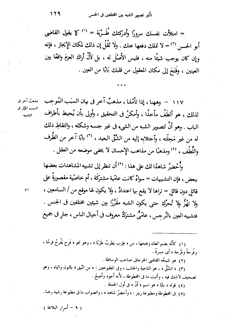 امتلأت نفسك سروراً وأدركتك طرْبَة كما يقول القاضي أبو الحسن لا تملك دفعها عنك، ولا تَقُلْ إن ذلك لمكان الإيجاز، فإنه وإن كان يوجب شيئاً منه، فليس الأصْلَ له، بل لأنْ أراك العزمَ واقعا ًبين العينين، وفَتَحَ إلى مكان المعقول من قلبك باباً من العين، وها هنا إذا تأمّلنا مذهبٌ آخر في بيان السبَب المُوجِب لذلك، هو ألطفُ مأخذاً، وأمكنُ في التحقيق وأولى بأن يُحيط بأطراف الباب، وهو أنَّ لتصوير الشبه من الشيء في غير جنسه وشكله، والتقاط ذلك له من غير مَحِلّته، واجتلابه إليه من الشِّقِّ البعيد، باباً آخر من الظَّرف واللُّطف، ومذهباً من مذاهب الإحسان لا يخفى موضعه من العقل، وأُحْضِرُ شاهداً لك على هذا: أن تنظر إلى تشبيه المشاهدات بعضها ببعض، فإن التشبيهات سواءٌ كانت عامّية مشتركَة، أم خاصّية مقصورةً على قائلٍ دون قائِل تراها لا يقع بها اعتدادٌ، ولا يكون لها موقع من السامعين، ولا تهُزُّ ولا تُحرِّك حتى يكون الشبه مُقَرَّراً بين شيئين مختلفين في الجنس، فتشبيه العين بالنَّرجِس، عامّيٌّ مشترَكٌ معروف في أجيال الناس، جارٍ في جميع