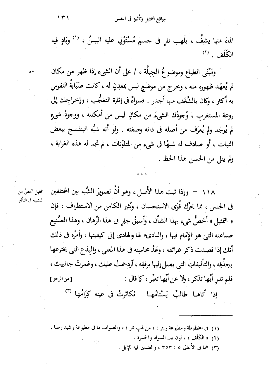 الماءَ منها يشِفُّ، بلهَب نارٍ في جسمٍ مُسْتَوْلٍ عليه اليبسُ، وبَادٍ فيه الكَلَف. ومَبْنَى الطباع وموضوعُ الجِبِلَّة، على أن الشيء إذا ظهر من مكان لم يُعْهَد ظهوره منه، وخرج من موضعٍ ليس بمعدِنٍ له، كانت صَبَابةُ النفوسِ به أكثر، وكان بالشَّغَف منها أجدر، فسواءٌ في إثارة التعجُّب، وإخراجك إلى روعة المستغربِ، وُجودُك الشيءَ من مكان ليس من أمكنته، ووجودُ شيءٍ لم يُوجَد ولم يُعرَف من أصله في ذاته وصفته، ولو أنه شَبَّه البنفسج ببعض النبات، أو صادف له شبهاً في شيء من المتلوّنات، لم تجد له هذه الغرابة، ولم ينل من الحسن هذا الحظ، وإذا ثبت هذا الأصل، وهو أنَّ تصويرَ الشَّبه بين المختلفين في الجنس، مما يحرِّك قُوَى الاستحسان، ويُثير الكامن من الاستظراف، فإن التمثيل أخَصُّ شيء بهذا الشأن، وأسبقُ جارٍ في هذا الرهان، وهذا الصَّنيع صناعته التي هو الإمام فيها، والبادئ لها والهادي إلى كيفيتها، وأمرُه في ذلك أنك إذا قصدت ذكر ظرائفه، وعَدَّ محاسِنه في هذا المعنى، والبِدَعِ التي يخترعها بحِذْقِه، والتأليفاتِ التي يصل إليها برفقِه، ازدحمتْ عليك، وغمرتْ جانبيك، فلم تدرِ أيَّها تذكر، ولا عن أيِّها تعبِّر، كما قال: