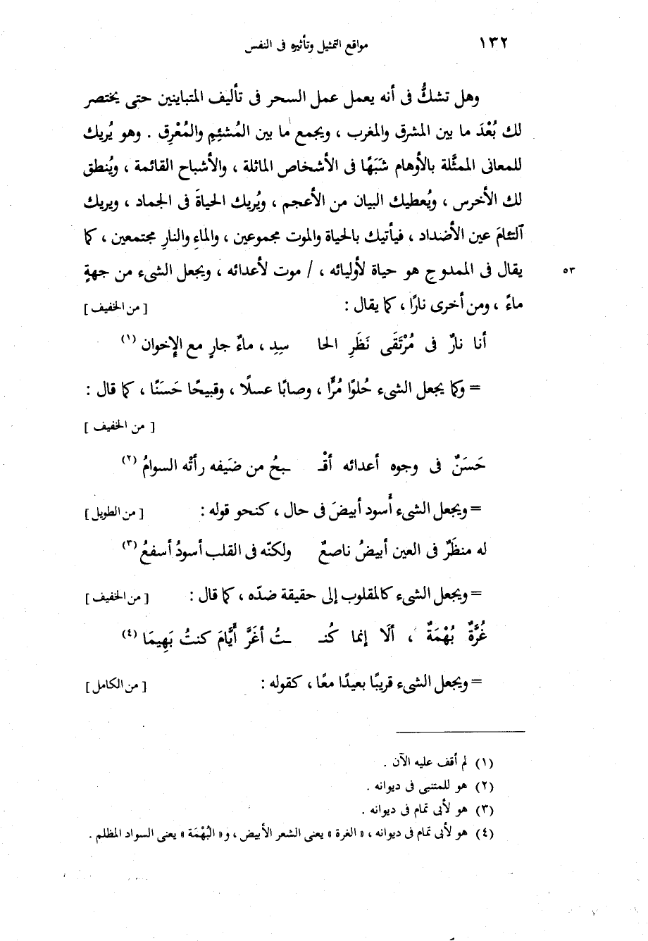 وهل تشكُّ في أنه يعمل عمل السحر في تأليف المتباينين حتى يختصر لك بُعْدَ ما بين المشرق والمغرب، ويجمع ما بين المُشئِمِ والمُعْرِق، وهو يُرِيكَ للمعاني الممثَّلة بالأوهام شَبَهاً في الأشخاص الماثلة، والأشباح القائمة، ويُنطق لك الأخرس، ويُعطيك البيان من الأعجم، ويُريك الحياةَ في الجماد، ويريك التئامَ عين الأضداد، فيأتيك بالحياة والموت مجموعين، والماءِ والنارِ مجتمعين، كما يقال في الممدوحِ هو حياة لأوليائه، موت لأعدائه، ويجعل الشيء من جهةٍ ماءً، ومن أخرى ناراً، كما يقال: