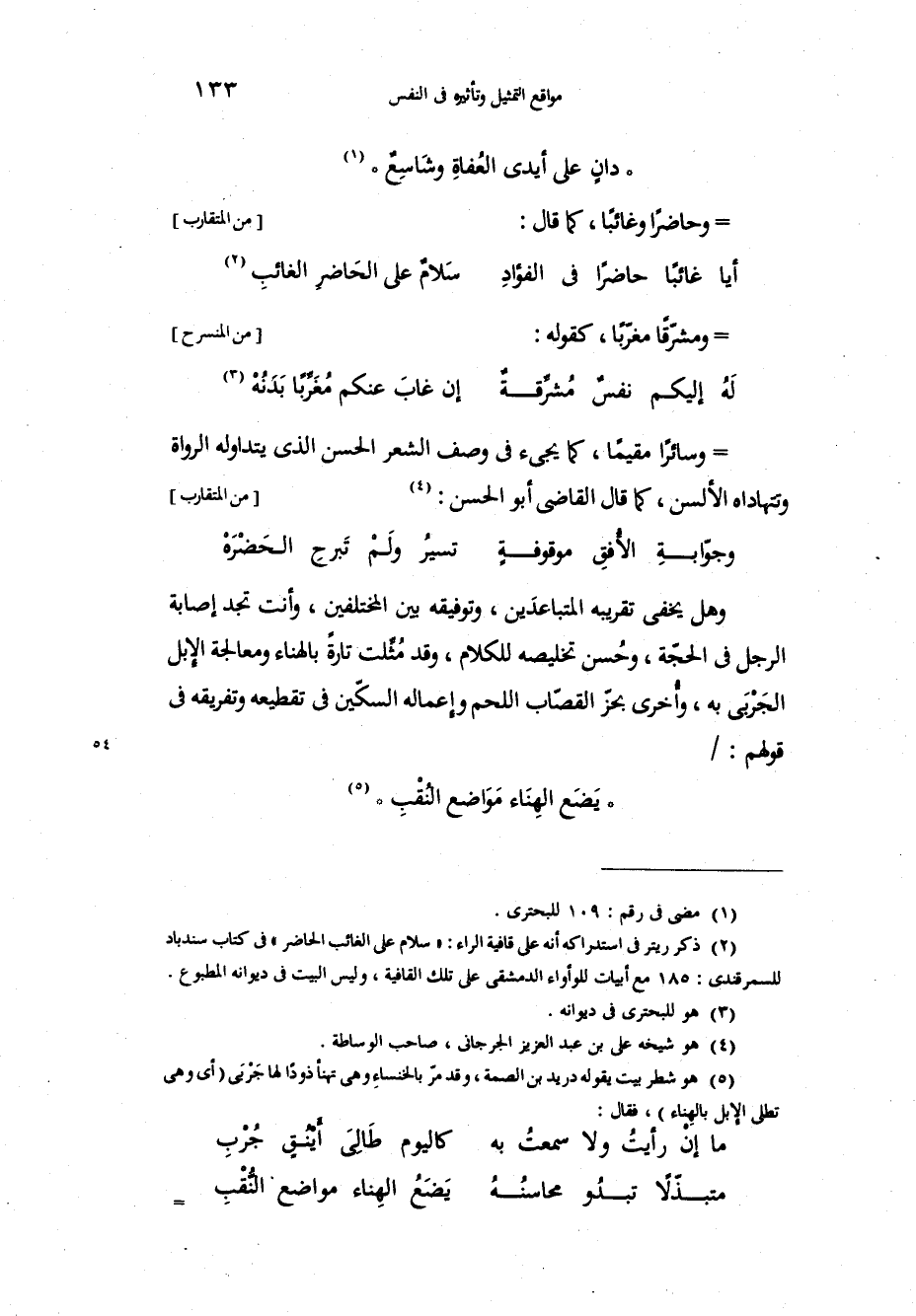 وهل يخفى تقريبه المتباعدين، وتوقيفه بين المختلفين، وأنت تجد إصابة الرجل في الحجّة، وحُسن تخليصه للكلام، وقد مُثِّلت تارةً بالهناء ومعالجة الإبل الجَرْبَى به، وأُخرَى بحزِّ القصّاب اللحم وإعماله السكّين في تقطيعه وتفريقه في قولهم " يَضَع الهِنَاء مَوَاضِع النُقْبِ