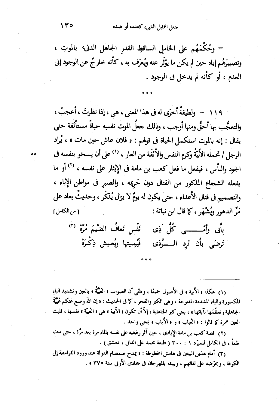 وحُكْمَهُمْ على الخامِل الساقطِ القدرِ الجاهل الدنيء بالموتِ، وتصييرَهُمْ إياه حين لم يكن ما يؤثَر عنه ويُعْرَف به، كأنه خارجٌ عن الوجود إلى العدم، أو كأنه لم يدخل في الوجود، ولطيفةٌ أخرى له في هذا المعنى، هي، إذا نظرتَ، أعجبُ، والتعجُّب بها أحقُّ ومنها أوجب، وذلك جعلُ الموت نفسِه حياةً مستأنفة حتى يقال: إنه بالموت استكمل الحياة في قولهم فلان عاش حين مات، يُراد الرجل تحمله الأبيّةُ وكرم النفس والأنَفَة من العار، على أن يسخو بنفسه في الجود والبأس، فيفعل ما فعل كعب بن مامة في الإيثار على نفسه، أو ما يفعله الشجاع المذكور من القتال دون حَرِيمه، والصبر في مواطن الإباء، والتصميم في قتال الأعداء، حتى يكون له يومٌ لا يزال يُذكَر، وحديثٌ يعاد على مَرِّ الدهور ويُشْهَر، كما قال ابن نباتة: