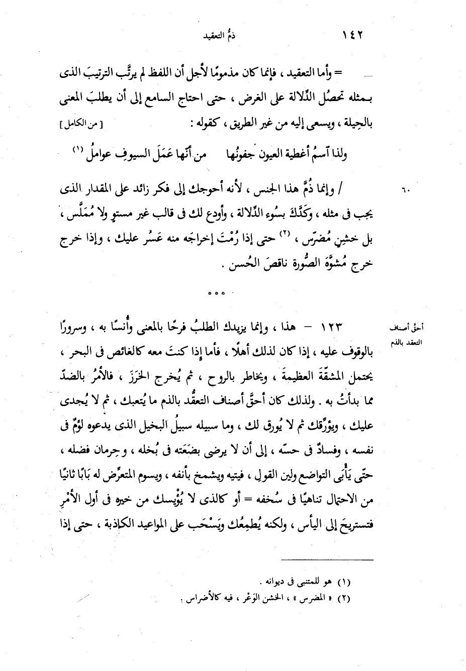 وإنما ذُمَّ هذا الجنس، لأنه أحوجك إلى فكر زائد على المقدار الذي يجب في مثله، وكَدَّكَ بسُوء الدَّلالة وأودع لك في قالب غير مستوٍ ولا مُمَلَّس، بل خشِنٍ مُضرّس حتى إذا رُمْتَ إخراجَه منه عَسُر عليك، وإذا خرج خرج مُشوَّه الصورة ناقصَ الحُسن، هذا وإنما يزيدك الطلبُ فرحاً بالمعنى وأُنْساً به وسروراً بالوقوف عليه إذا كان لذلك أهلاً، فأمّا إذا كنتَ معه كالغائص في البحر، يحتمل المشقّة العظيمة، ويخاطر بالروح، ثم يُخرج الخرَزَ، فالأمرُ بالضدّ مما بدأتُ به، ولذلك كان أحقَّ أصناف التعقُّد بالذم ما يُتعبك، ثم لا يُجدي عليك، ويؤرِّقك ثم لا يُورق لك، وما سبيله سبيلُ البخيل الذي يدعوه لؤمٌ في نفسه، وفساد في حسّه، إلى أن لا يرضى بضَعَته في بُخْله، وحِرمان فضله، حتّى يَأْبَى التواضع ولين القول، فيتيه ويشمخ بأنفه، ويسوم المتعرِّض له باباً ثانياً من الاحتمال تناهياً في سُخفه أو كالذي لا يُؤيسك من خيره في أول الأمْرِ فتستريحَ إلى اليأس، ولكنه يُطمِعُك ويَسْحَب على المواعيد الكاذبة، حتى إذا