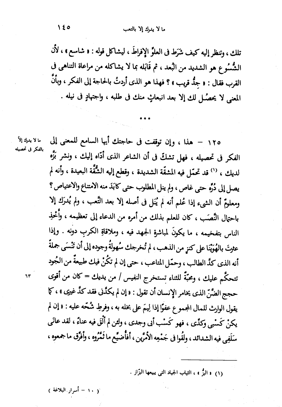 تلك، وتنظر إليه كيف شَرَطَ في العلوِّ والإفراطَ، ليشاكل قوله شاسع، لأن الشُّسُوع هو الشديد البُعد، ثم قَابَله بما لا يشاكله من مراعاة التناهي في القرب فقال " جِدُّ قريب " فهذا هو الذي أردتُ بالحاجة إلى الفكر، وبأنَّ المعنى لا يحصُل لك إلا بعد انبعاثٍ منك في طلبه، واجتهادٍ في نيله، هذا وإن توقفت في حاجتك أيها السامع للمعنى إلى الفكر في تحصيله، فهل تشكّ في أن الشاعر الذي أدّاه إليك، ونشر بَزَّه لديك، قد تحمّل فيه المشقّة الشديدة، وقطع إليه الشُّقة البعيدة، وأنه لم يصل إلى دُرِّه حتى غاص، ولم ينل المطلوب حتى كابدَ منه الامتناع والاعتياص؛ ومعلومٌ أن الشيء إذا عُلم أنه لم يُنَل في أصله إلا بعد التَّعب، ولم يُدرَك إلا باحتمال النَّصَب، كان للعلم بذلك من أمره من الدعاء إلى تعظيمه، وأخْذِ الناس بتفخيمه، ما يكونَ لمباشرة الجهد فيه، وملاقاةِ الكرب دونه، وإذا عثرتَ بالهُوَيْنَا على كنزٍ من الذهب، لم تُخرجك سُهولةُ وجوده إلى أن تَنْسَى جملةً أنه الذي كدَّ الطالب، وحمّل المتاعب، حتى إن لم تكُنْ فيك طبيعةٌ من الجُود تتحكَّم عليك، ومحبّة للثناء تستخرج النفيس من يديك كان من أقوى حجج الضَّنّ الذي يخامر الإنسان أن تقول: إن لم يكدَّني فقد كدَّ غيري، كما يقول الوارث للمال المجموع عفواً إذا لِيمَ على بخله به، وفرطِ شُحّه عليه: إن لم يكنْ كَسْبِي وكدَّي، فهو كَسْب أبي وجدي، ولئن لم ألْقَ فيه عناءً، لقد عانَى سَلَفِي فيه الشدائد، ولقُوا في جَمْعِهِ الأمَّرين، أفأضيِّع ما ثَمَّرُوه، وأُفَرِّق ما جمعوه،