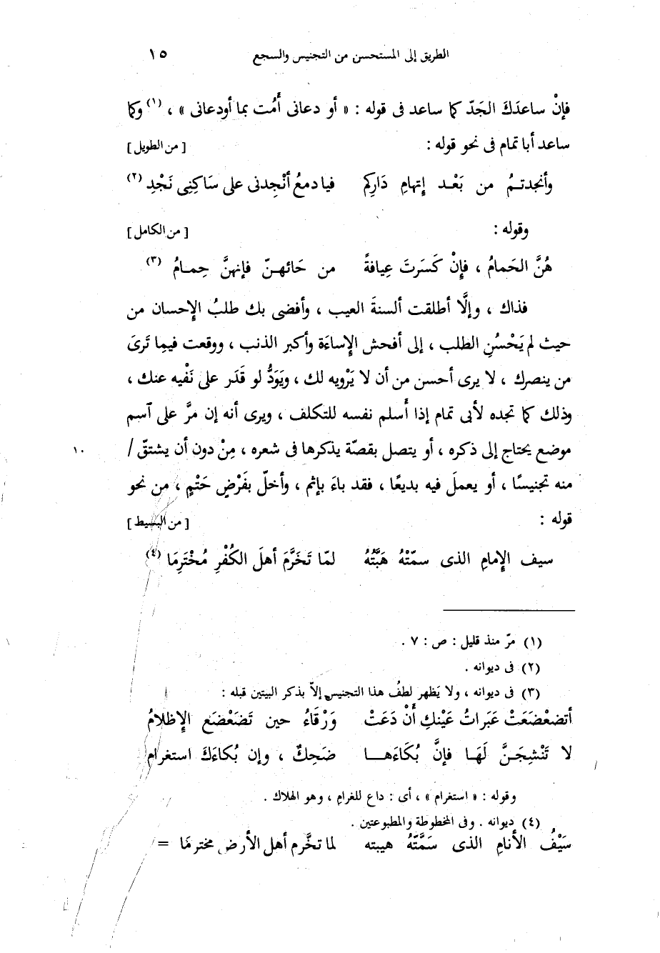 فذاك، وإلاّ أطلقت ألسنة العيب، وأفضى بك طلبُ الإحسانُ من حيث لم يَحْسُنِ الطلبِ، إلى أفحش الإساءة وأكبر الذنب، ووقعت فيمِا تَرَى من ينصرك، لا يرى أحسن من أن لا يَرْويه لك، ويَوَدُّ لو قَدَر على نَفْيه عنك، وذلك كما تجده لأبي تمام إذا أسلم نفسه للتكلف، ويرى أنه إن مرَّ على اسم موضع يحتاج إلى ذكره أو يتصل بقصة يذكرها في شعره، مِنْ دُونَ أن يشتقّ منه تجنيساً، أو يعمل فيه بديعاًَ، فقد باء بإثم، وأخلّ بفَرْضِ حَتْمٍ، من نحو قوله:
