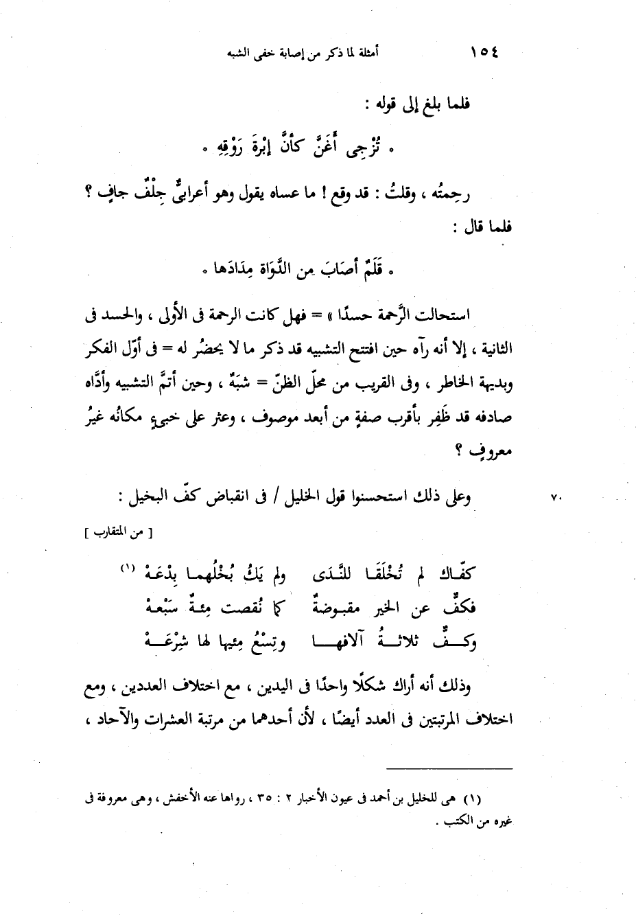 فلّما بلغ إلى قوله " تُزْجِي أَغَنَّ كَأنَّ إبْرَةَ رَوْقِهِ ". رحِمتُه وقلتُ قد وقع ما عساه يقول وهو أعرابيٌّ جِلْفٌ جافٍ؟ فلما قال: " قَلَمٌ أَصَابَ من الدَّوَاة مِدَادَها " استحالت الرَّحمة حسداً فهل كانت الرحمة في الأولى، والحسد في الثانية، إلا أنه رآه حين افتتح التشبيه قد ذكر ما لا يحضرُ له في أوّل الفكر وبديهة الخاطر، وفي القريب من محلّ الظنّ شبَهٌ، وحين أتمَّ التشبيه وأدَّاه صادفه قد ظِفَر بأقرب صفةٍ من أبعد موصوف، وعثر على خبيءٍ مكانُه غيرُ معروفٍ، وعلى ذلك استحسنوا قول الخليل في انقباض كفّ البخيل: