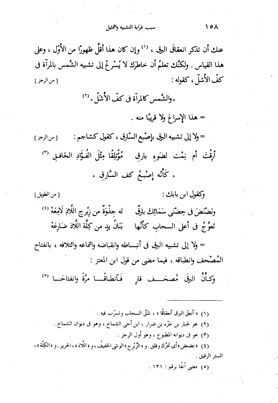 عنك أن تذكر انعقاق البرق، وإن كان هذا أقلَّ ظهوراً من الأوّل، وعلى هذا القياس، ولكنَّك تعلمُ أن خاطرَك لا يُسْرعُ إلى تشبيه الشَّمس بالمرآة في كفّ الأشلّ، كقوله " والشَّمس كالمرآة في كفّ الأشلْ "؛ هذا الإسراعَ ولا قريباً منه، ولا إلى تشبيه البرق بإصْبع السّارق، كقول كشاجِم: