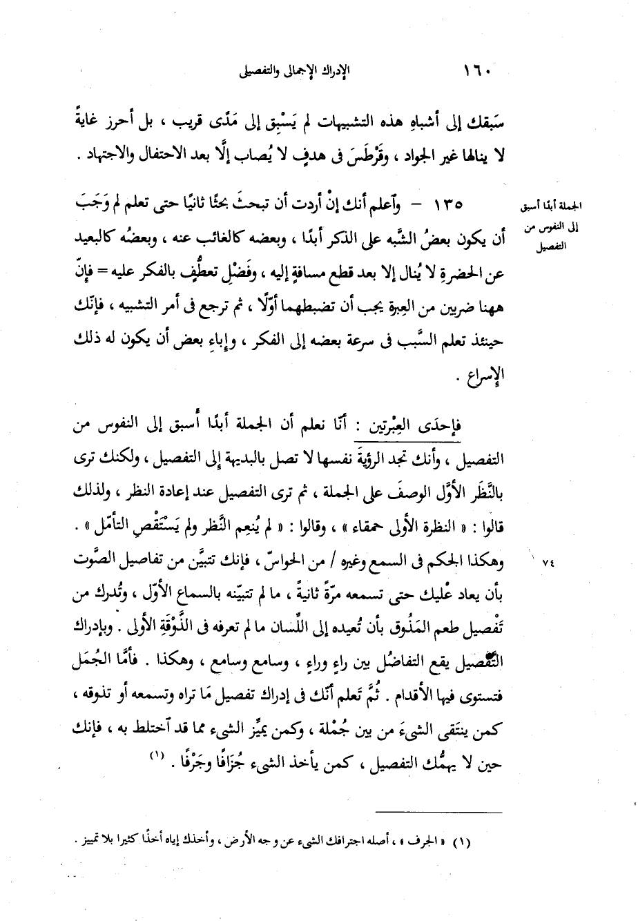 سبَقَك إلى أشباهِ هذه التشبيهات لم يَسْبِق إلى مَدًى قريب، بل أحرز غايةً لا ينالها غير الجواد، وقَرْطَسَ في هدفِ لا يُصابُ إلاّ بعد الاحتفال والاجتهاد. واعلم أنك إنْ أردت أن تبحث بحثاً ثانياً حتى تعلم لم وَجَبَ أن يكون بعضُ الشَّبه على الذكر أبداً، وبعضه كالغائب عنه، وبعضُه كالبعيد عن الحضرةِ لا يُنال إلا بعد قطع مسافةٍ إليه، وفَضْل تعطُّفٍ بالفكر عليه فإنّ ها هنا ضربين من العِبرة يجب أن تضبطهما أوّلاً، ثم ترجع في أمر التشبيه، فإنّك حينئذ تعلم السَّبب في سرعة بعضه إلى الفكر، وإباءِ بعض أن يكون له ذلك الإسراع. فإحدَى العِبْرَتين أنّا نعلم أن الجملة أبداً أسبق إلى النفوس من التفصيل، وأنت تجد الرؤية نفسها لا تصل بالبديهة إلى التفصيل، لكنك ترى بالنَّظَر الأوَّل الوصفَ على الجملة، ثم ترى التفصيل عند إعادة النظر، ولذلك قالوا: النظرة الأولى حمقاء، وقالوا لم يُنعِم النَّظَر ولم يَسْتَقْصِ التأمّل، وهكذا الحكم في السمع وغيره، من الحواس، فإنك تتبيّن من تفاصيل الصَّوت بأن يعاد عليك حتى يسمعه مرّةً ثانيةً، ما لم تتبيّنه بالسماع الأول، وتُدرك من تَفْصيل طعم المَذُوق بأن تعيده إلى اللِّسان ما لم تعرفه في الذَّوْقَةِ الأولى، وبإدراك التَّفصيل يقع التفاضُل بين راءٍ وراءٍ، وسامع وسامع، وهكذا، فأمَّا الجُمَل فتستوي فيها الأقدام، ثُمَّ تَعلم أنّك في إدراك تفصيل مَا تراه وتسمعه أو تذوقه، كمن ينتَقي الشيء من بين جُمْلة، وكمن يميِّز الشيء مما قد اختلط به، فإنك حين لا يهمُّك التفصيل، كمن يأخذ الشيء جُزَافاً وجَرْفاً.