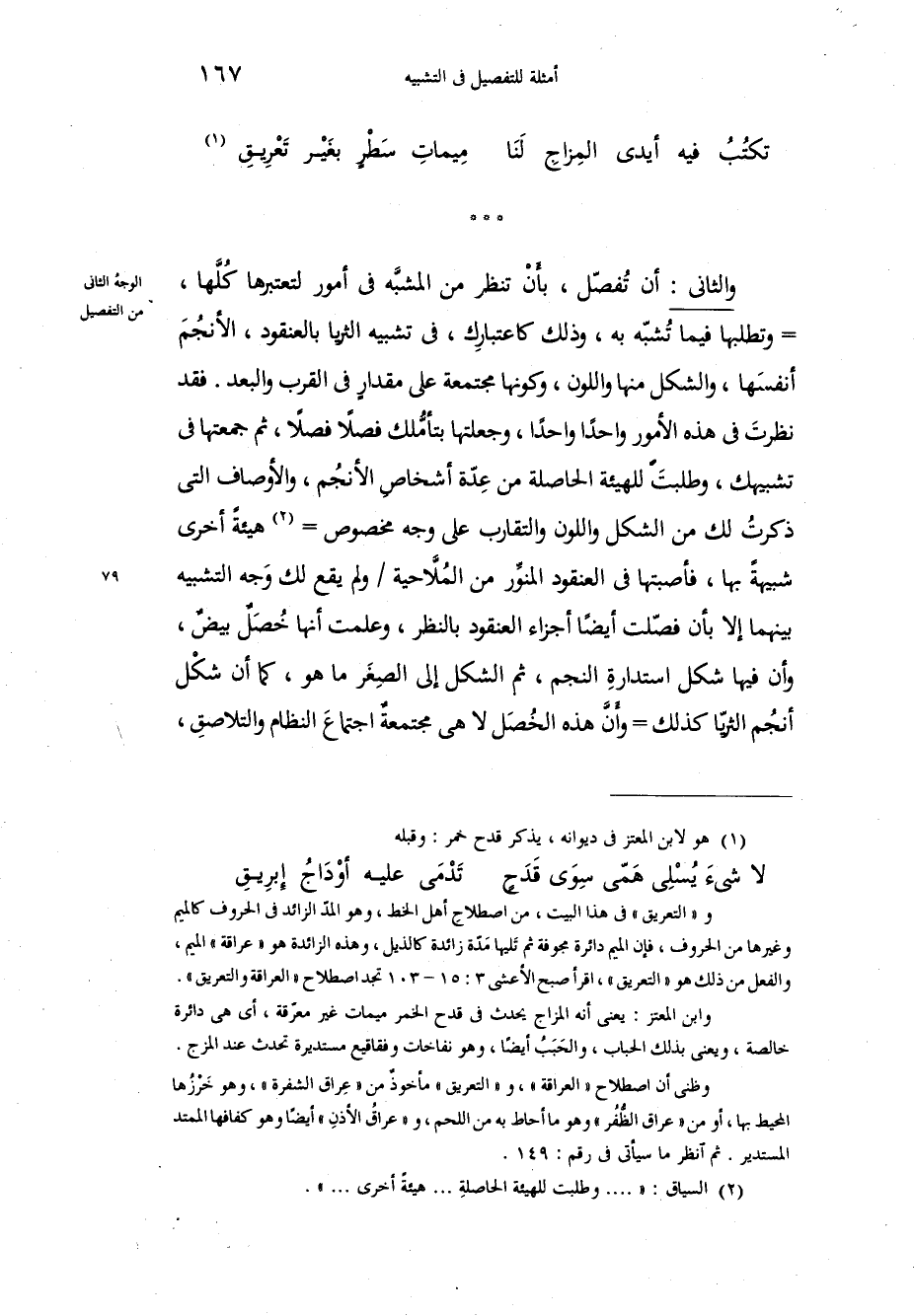والثاني أن تُفصّل، بأنْ تنظر من المشبَّه في أمور لتعتبرها محلها، وتطلبها فيما تُشبّه به، وذلك كاعتبارك، في تشبيه الثريا بالعنقود، الأنجُمَ أنفسَها، والشكل منها واللون، وكونها مجتمعة على مقدارٍ في القرب والبعد، فقد نظرتَ في هذه الأمور واحداً واحداً، وجعلتها بتأمُّلك فصلاً فصلاً، ثم جمعتها في تشبيهك، وطلبتَ للهيئة الحاصلة من عِدّة أشخاصِ الأنجُمَ، والأوصاف التي ذكرتُ لك من الشك واللون والتقارب على وجه مخصوص هيئةً أخرى شبيهةً بها، فأصبتها في العنقود المنِّور من المُلاَّحية ولم يقع لك وَجه التشبيه بينهما إلا بأن فصّلت أيضاً أجزاء العنقود بالنظر، وعلمت أنها خُصَلٌ بيضٌ، وأن فيها شكل استدارةِ النجم، ثم الشكل إلى الصِغَر ما هو، كما أن شكْل أنْجُم الثريّا كذلك وأنَّ هذه الخُصَل لا هي مجتمعةٌ اجتماع النظام والتلاصقِ،