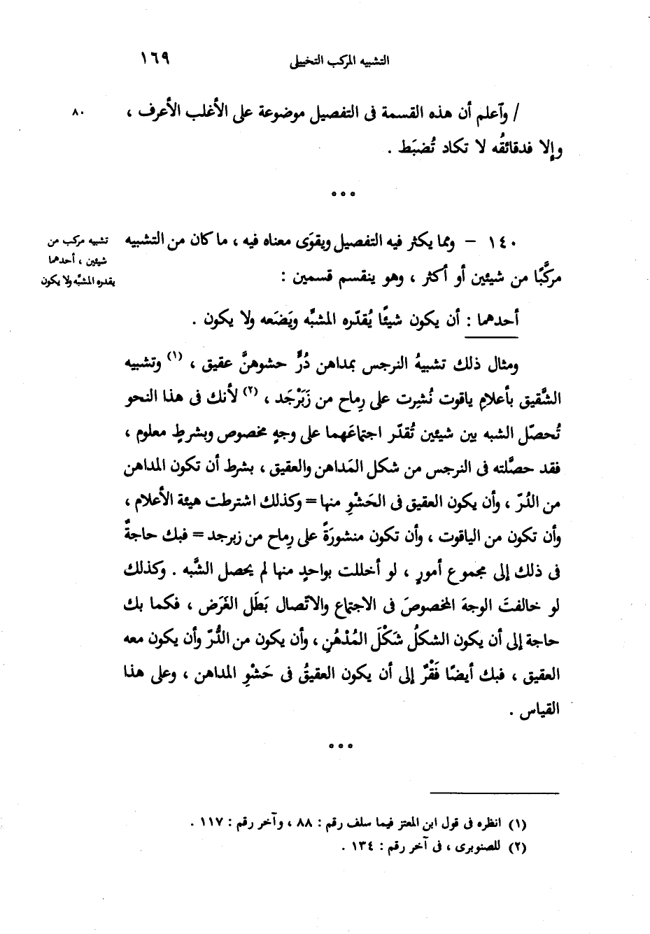 واعلم أن هذه القسمة في التفصيل موضوعة على الأغلب الأعرف، وإلا فدقائقُه لا تكاد تُضبَط، ومما يكثر فيه التفصيل ويقوَى معناه فيه، ما كان من التشبيه مركَّباً من شيئين أو أكثر، وهو ينقسم قسمين: أحدهما أن يكون شيئاً يُقدّره المشبِّه ويَضَعَه ولا يكون، ومثال ذلك تشبيه النرجس بمداهن دُرٍّ حشوهنَّ عقيق، وتشبيه الشَّقيق بأعلامِ ياقوت نُشِرت على رِماح من زَبَرْجَد، لأنك في هذا النحو تُحصّل الشبه بين شيئين تُقدّر اجتماعَهما على وجهٍ مخصوص وبشرطٍ معلومٍ، فقد حصَّلته في النرجس من شكل المدَاهن والعقيق، بشرط أن تكون الداهن من الدُرّ، وأن يكون العقيق في الحَشْوِ منها وكذلك اشترطت هيئة الأعلام، وأن تكون من الياقوت، وأن تكون منشورَةٌ على رماح من زبرجد فبك حاجةٌ في ذلك إلى مجموع أمورٍ، لو أخللت بواحدٍ منها لم يحصل الشَّبه، وكذلك لو خالفتَ الوجَه المخصوصَ في الاجتماع والاتصال بَطَل الغَرَض، فكما بك حاجة إلى أن يكون الشكلُ شَكْلَ المُدْهُنِ، وأن يكون من الدُّرّ وأن يكون معه العقيق، فبك أيضاً فَقْرٌ إلى أن يكون العقيقُ في حَشْوِ المداهن، وعلى هذا القياس،