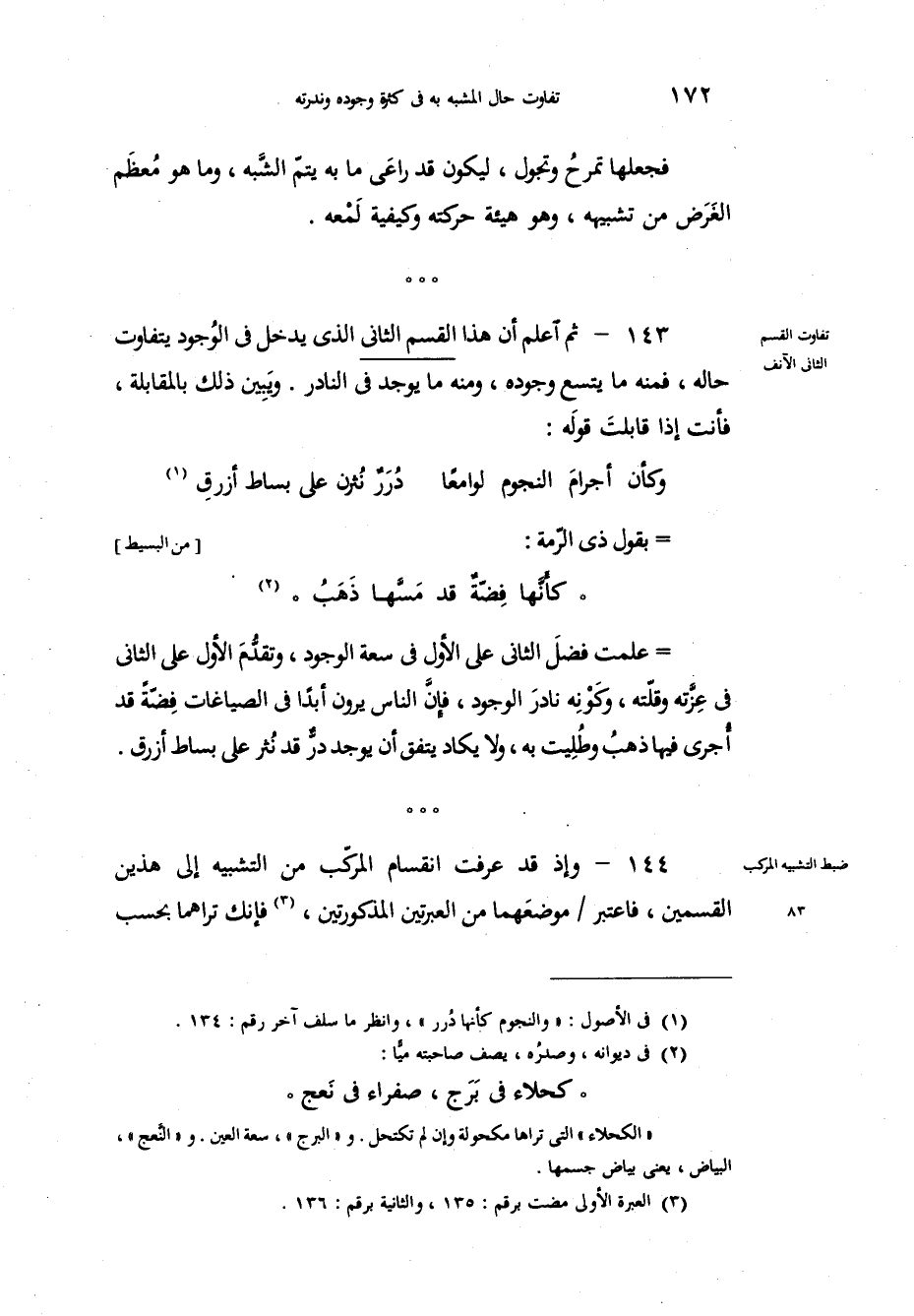 فجعلها تمرحُ وتجول، ليكون قد راعَى ما به يتمّ الشَّبه، وما هو مُعظَم الغَرَض من تشبيهه، وهو هيئة حركته وكيفية لَمْعه. ثم اعلم أن هذا القسم الثاني الذي يدخل في الوُجود يتفاوت حاله، فمنه ما يتسع وجوده، ومنه ما يوجد في النادر، ويَبِين ذلك بالمقابلة، فأنت إذا قابلتَ قولَه: