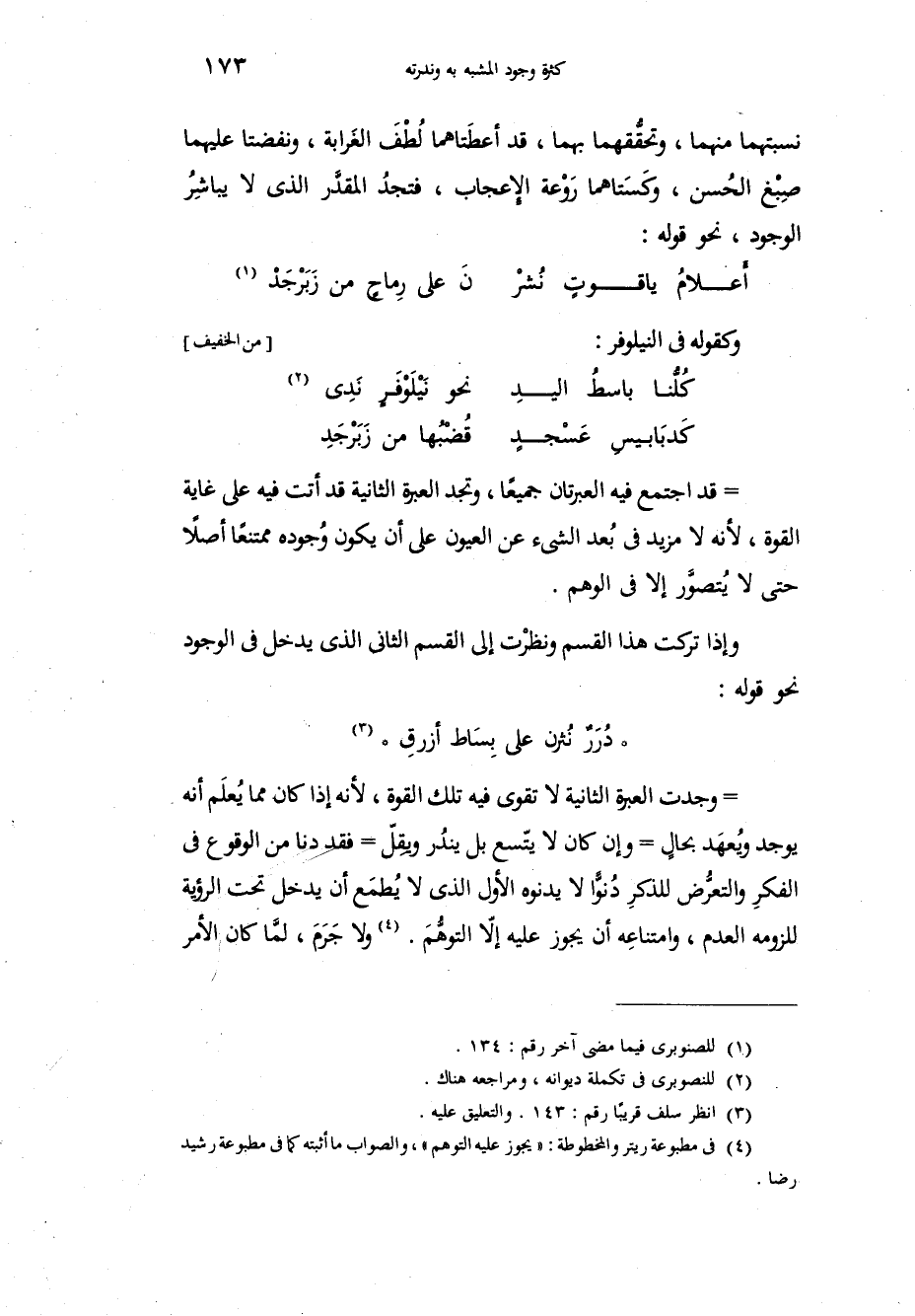 نسبتهما منهما، وتحقُّقهما بهما، قد أعطَتَاهما لُطْفَ الغَرابة، ونفضتا عليهما صِبْغ الحُسن، وكَستَاهما رَوْعةَ الإعجاب، فتجدُ المقدَّر الذي لا يباشرُ الوجود، نحو قوله: