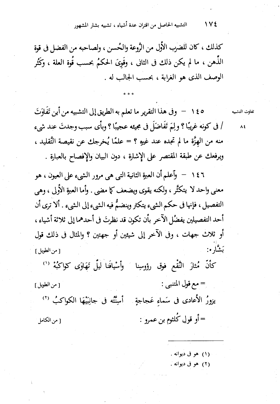 كذلك، كان للضرب الأول من الرَوعة والحُسن، لصاحبه من الفضل في قوة الذِّهن، ما لم يكن ذلك في الثاني، وقَوِيَ الحكُمُ بحسب قُوة العلة، وكَثُر الوصف الذي هو الغرابة، بحسب الجالب له، وفي هذا التقرير ما تعلم به الطريق إلى التشبيه من أين تَفَاوَتَ في كونه غَريباً؟ وَلِمَ تَفَاضَلَ في مجيئه عجيباً؟ وبأي سبب وجدتَ عند شيء منه من الهِزَّة ما لم تجده عند غيره علماً يُخرجك عن نقيصة التَّقليد، ويرفعك عن طبقة المقتصر على الإشارة، دون البيان والإفصاح بالعبارة. واعلم أن العبرة الثانية التي هي مرور الشيء على العيون، هو معنى واحد لا يتكثَّر، ولكنه يقوى ويضعف كما مضى، وأما العبرة الأولى، وهي لتفصيل فإنها في حكم الشيء يتكثر وينضمُّ فيه الشيء إلى الشيء، ألا ترى أن أحد التفصيلين يفضُل الآخر بأن تكون قد نظرتَ في أحدهما إلى ثلاثة أشياء، أو ثلاث جهات، وفي الآخر إلى شيئين أو جهتين والمثال في ذلك قول بَشَّار: