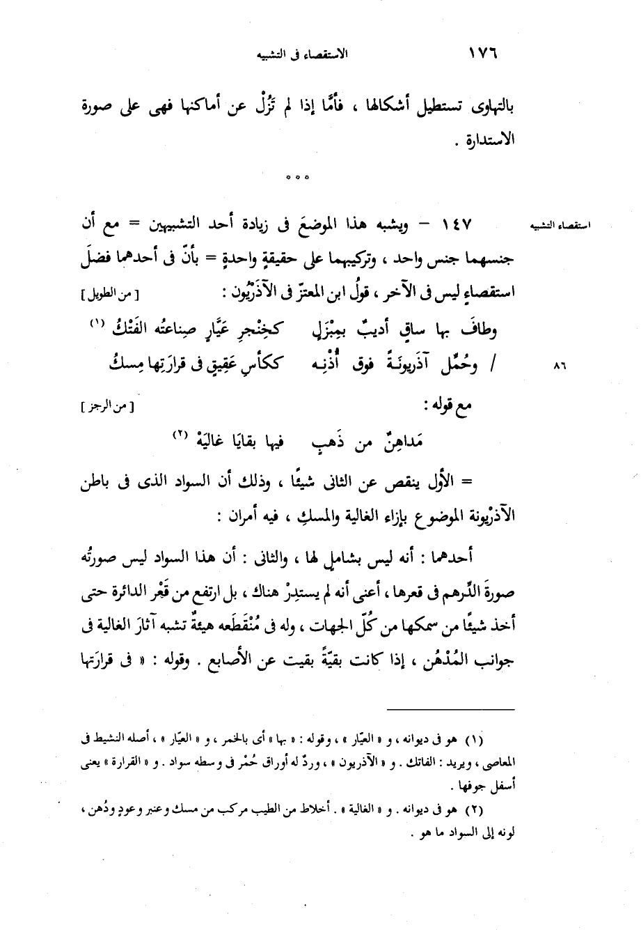 بالتهاوي تستطيل أشكالها، فأمّا إذا لم تَزُلْ عن أماكنها فهي على صورة الاستدارة. ويشبه هذا الموضعَ في زيادة أحد التشبيهين مع أن جنسهما جنس واحد، وتركيبهما على حقيقة واحدةٍ بأنّ في أحدهما فضلَ استقصاءٍ ليس في الآخر، قولُ ابن المعتزّ في الآذرْيُون: