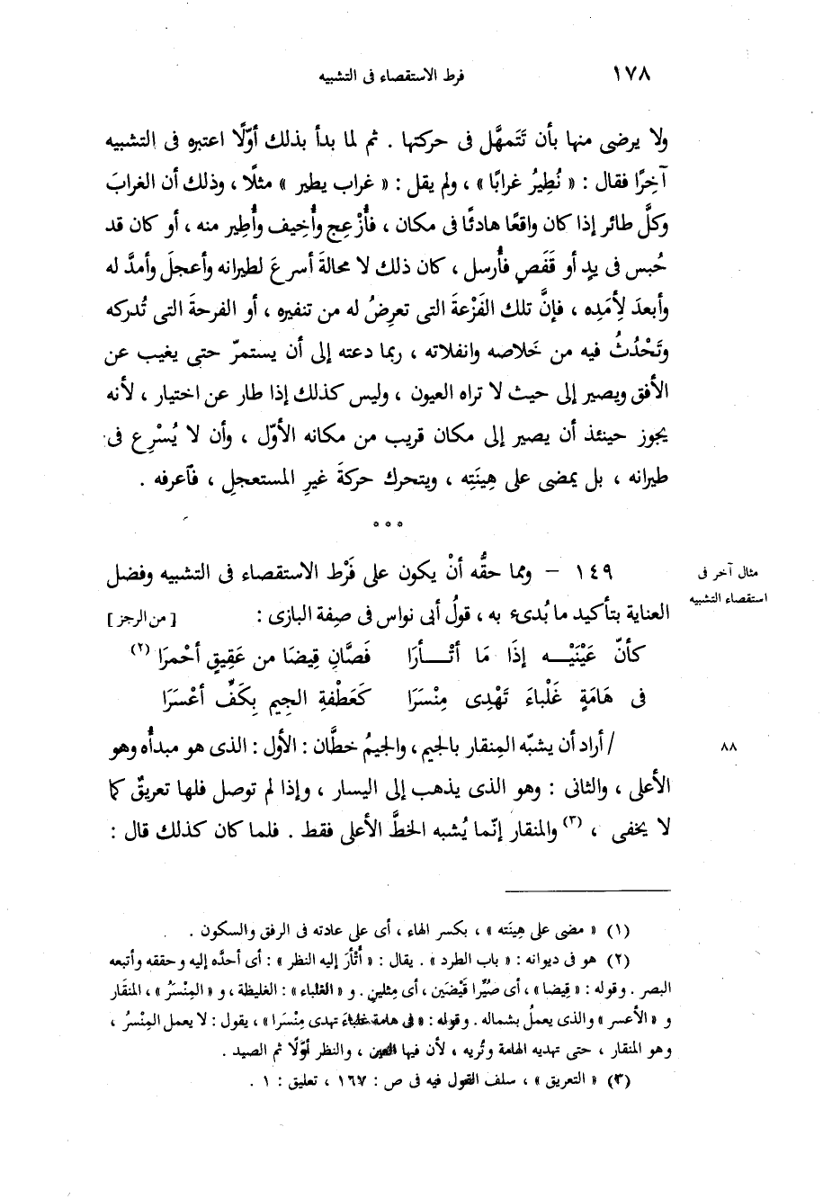 ولا يرضى منها بأن تَتَمهَّل في حركتها، ثم لما بدأ بذلك أوّلاً اعتبره في التشبيه آخِراً فقال: نُطِيرُ غراباً، ولم يقل: غراب يطير مثلاً، وذلك أن الغرابَ وكلَّ طائر إذا كان واقعاً هادئاً في مكان، فأُزْعِج وأُخِيفَ وأُطِير منه، أو كان قد حُبس في يدٍ أو قَفَصٍ فأُرسل، كان ذلك لا محالةَ أسرعَ لطيرانه وأعجلَ وأمدَّ له وأبعدَ لأمَدِهِ، فإنَّ تلك الفَزْعةَ التي تعرِضُ له من تنفيره، أو الفرحة التي تُدركه وتَحْدُثُ فيه من خَلاصه وانفلاته، ربما دعته إلى أن يستمرّ حتى يغيب عن الأفق ويصير إلى حيث لا تراه العيون، وليس كذلك إذا طار عن اختيار، لأنه يجوز حينئذ أن يصير إلى مكان قريب من مكانه الأوّل، وأن لا يُسْرِع في طيرانه، بل يمضي على هِينَتِه ويتحرّك حركةَ غيرِ المستعجلِ فاعرفه. ومما حقُّه أنْ يكون على فَرْط الاستقصاء في التشبيه وفضل العناية بتأكيد ما بُدئ به، قولُ أبي نواس في صِفة البازي: