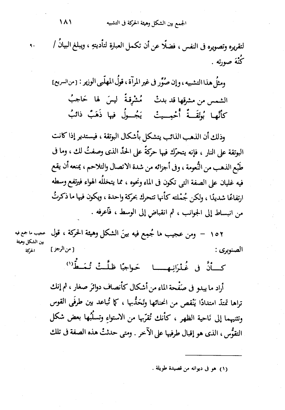 لتقريره وتصويره في النفس، فضلاً عن أن تكمل العبارة لتأديتهِ، ويبلغ البيانُ كُنْهَ صورته، ومثلُ هذا التشبيه، وإن صُوِّر في غير المرآة، قولُ المهلّبي الوزير: