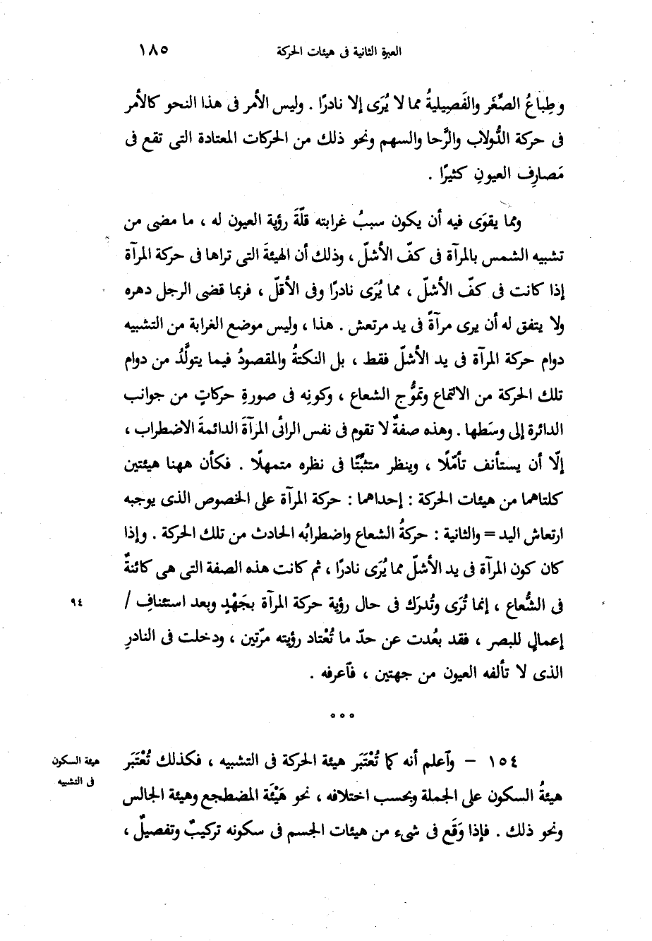 وطباعُ الصِّغَر والفَصِيلةُ مما لا يُرَى إلا نادراً، وليس الأمر في هذا النحو كالأمر في حركة الدُّولاب والرَّحا والسهم ونحو ذلك من الحركات المعتادة التي تقع في مَصارِف العيونِ كثيراً، ومما يقوَى فيها أن يكون سببُ غرابته قلّةَ رؤية العيون له، ما مضى من تشبيه الشمس بالمرآة في كفّ الأشّل، وذلك أن الهيئةَ التي تراها في حركة المرآة إذا كانت في كفّ الأشلّ، مما يُرَى نادراً وفي الأقلّ، فربما قضى الرجل دهره ولا يتفق له أن يرى مرآةً في يد مرتعش، هذا وليس موضع الغرابة من التشبيه دوام حركة المرآة في يد الأشلّ فقط، بل النكتة والمقصودُ فيما يتولَّدُ من دوام تلك الحركة من الالتماع وتموَّج الشعاع، وكونه في صورةِ حركاتٍ من جوانب الدائرة إلى وسطها، وهذه صفةٌ لا تقوم في نفس الرائي المرآةَ الدائمةَ الاضطراب، إلاّ أن يستأنف تأمّلاً، وينظر متثبِّتَاً في نظره متمهلاً، فكأن ها هنا هيئتين كلتاهما من هيئات الحركة إحداهما حركة المرآة على الخصوص الذي يوجبه ارتعاش اليد والثانية حركةُ الشعاع واضطرابُه الحادث من تلك الحركة، وإذا كان كون المرآة في يد الأشلّ مما يُرَى نادراً، ثم كانت هذه الصفة التي هي كائنةٌ في الشُّعاع، إنما تُرَى وتُدرَك في حال رؤية حركة المرآة بجَهْدٍ وبعد استئنافِ إعمالٍ للبصر، فقد بعُدت عن حدّ ما تُعْتاد رؤيته مرّتين، ودخلت في النادرِ الذي لا تألفه العيون من جهتين فاعرفه. واعلم أنه كما تُعْتَبرَ هيئة الحركة في التشبيه، فكذلك تُعْتَبَر هيئةُ السكون على الجملة وبحسب اختلافه، نحو هيْئة المضطجع وهيئة الجالس ونحو ذلك، فإذا وَقَع في شيء من هيئات الجسم في سكونه تركيبٌ وتفصيلٌ،