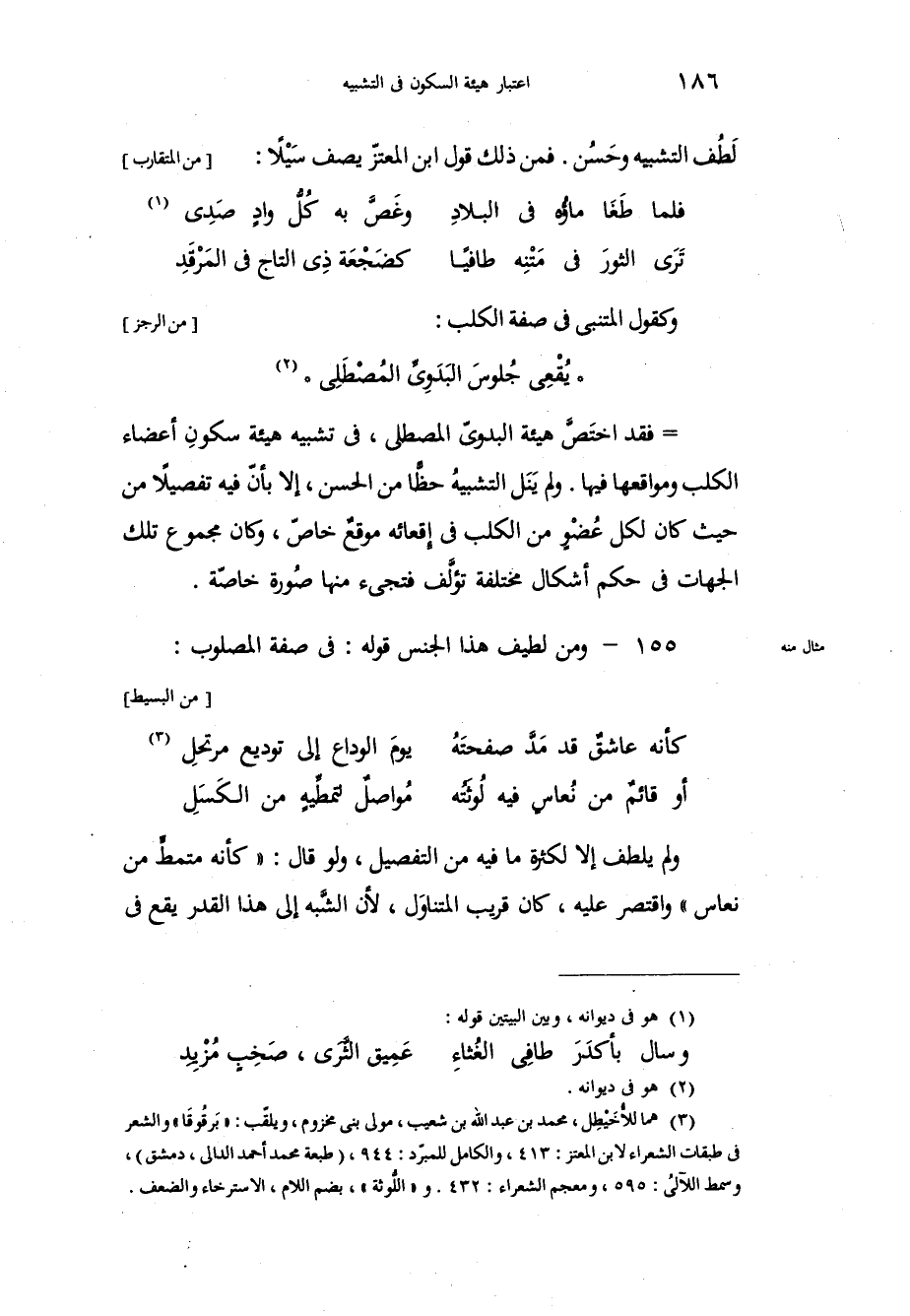 وكقول المتنبي في صفة الكلب: " يُقْعِي جُلوس البَدَوِيِّ المُصطَلِي ". فقد اختَصَّ هيئة البدويّ المصطلي، في تشبيه هيئة سكون أعضاء الكلب ومواقعها فيها، ولم يَنَل التشبيهُ حظّاً من الحسن، إلا بأنّ فيه تفصيلاً من حيث كان لكل عُضوٍ من الكلب في إقعائه موقعٌ خاصّ، وكان مجموع تلك الجهات في حكم أشكال مختلفة تؤلَّف فتجيء منها صُورة خاصّة، ومن لطيف هذا الجنس قوله في صفة المصلوب: